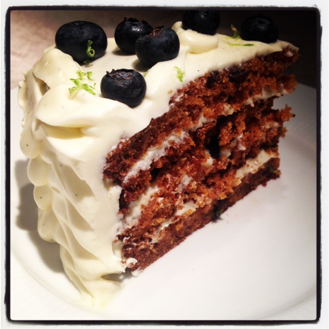 Deilig, saftig gulrotkake med blåbær og limekrem