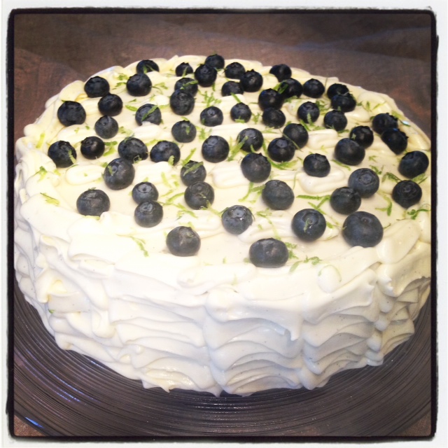 Pynt kaken med blåbær og revet limeskall. Til sommeren tror jeg at jordbær og lime blir en uslåelig kombinasjon på denne kaken. Dessverre er det dårlig med jordbærsesong både på Rema og her oppe i Trøndelag nå, så i dag ble det blåbær 🙂