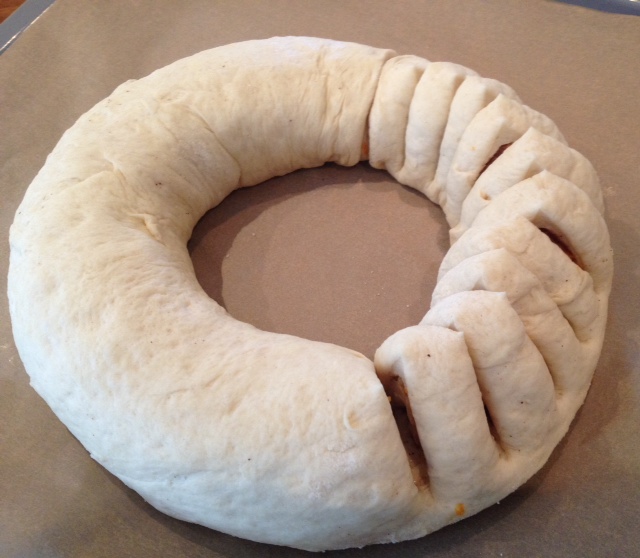 Rull sammen fra langsiden, legg pølsa på et steikebrett med bakepapir og form til en sirkel. Så tar du saksen og klipper ovenfra og ned. Pass på at du ikke klipper helt igjennom med lar det være igjen 1,5 cm.