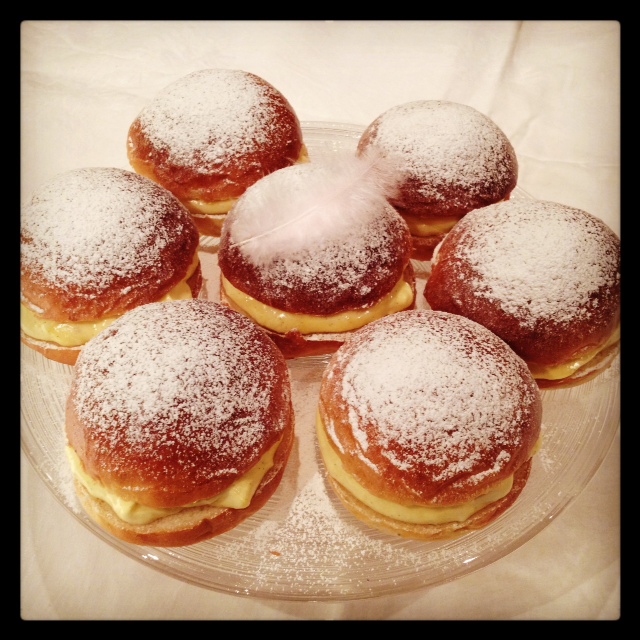 bilde12Hva er vel fastelavn uten boller? Deilige, saftige, luftige boller med hjemmelaget vaniljekrem og nyrørte bringebær inni. Eller pernillekrem som min sønn på 3 år kalte vaniljekremen tidligere i dag 😉 Herlig liten tass!  Et lite skjær i gleden ved dagens baking, er mors smaksløker, eller mangel på sådan. Sitter her snyte forkjøla med smaksløker som en hoggorm uten hoggtenner.. Håper resten av familien satte pris på bollene. De så nå i alle fall kjempegode ut 🙂