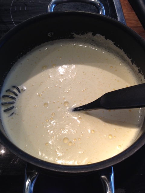 Ta kasserollen av plata og tilsett 1 plate gelatin som du har hatt liggende i vann i 5 min. Skvis ut vannet og rør den godt inn i den varme kremen.