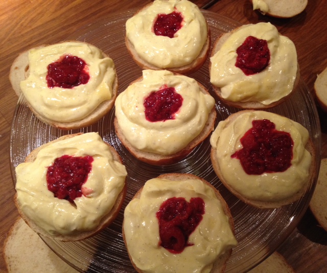 I tillegg kan du fylle en grop inni bollene med rørt bringebær. Jeg tar rett og slett og tiner en pose med frosne bringebær, tilsetter 2 dl melis og rører rundt til melisen er oppløst. Sil av overflødig veske og ha syltetøyet i bollene sammen med kremen. Lag gjerne en grop i kremen som du fyller med syltetøy, så slipper du at det renner ut for deg.