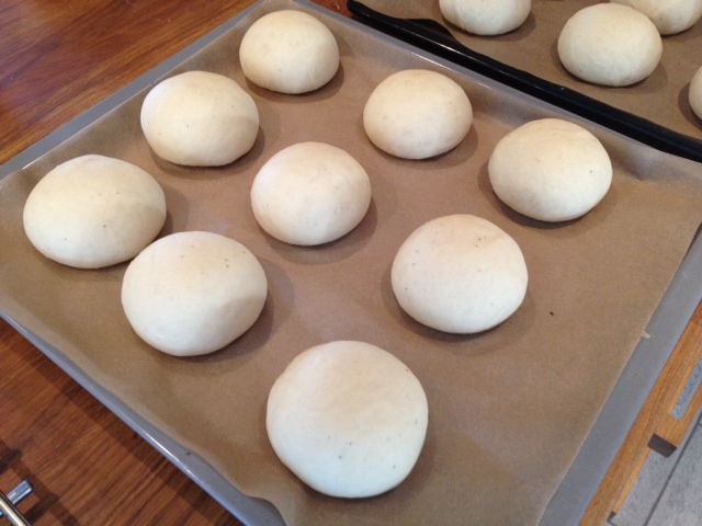 Når deigen er vokst til dobbel størrelse, hvelver du den ut på et bakeunderlag av plast el silikon. Grunnen til at jeg bruker det, er at da slipper jeg å mele overflaten som jeg skal trille ut bollene på. Mer mel gjør bollene tørrere. Uten å elte i deigen, tar jeg å deler opp i emner som jeg triller ut for hånd. Trill med hul hånd over emnet til du har fått en jevn, fin overflate på bollen. Dette vil gi penest resultat ved steking senere. Forsøk å mos bolledeigen minst mulig og heller bevar luftporene på best mulig måte. Sett bollene på et steikebrett dekket med bakepapir og sett til heving under et klede på et lunt sted i 30-40 min.