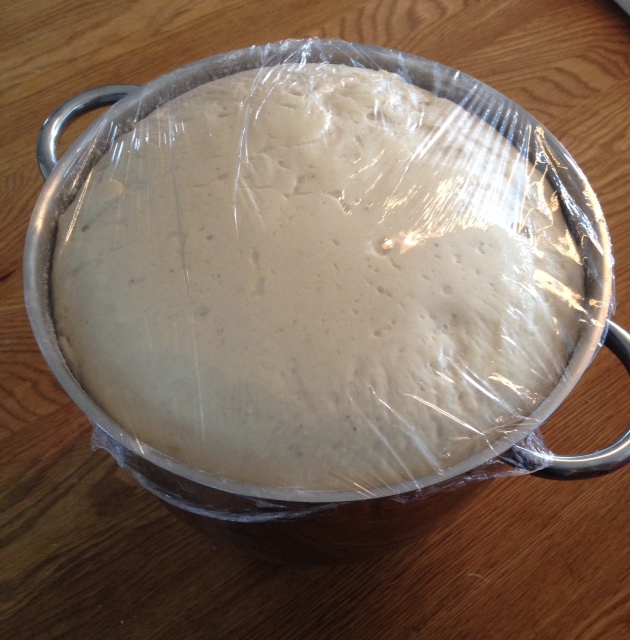 Strø et tynt lag med hvetemel på toppen av deigen, dekk til med plastfolie og sett deigen på et lunt sted til dobbel størrelse. Viktig å dekke til med plast og ikke bare et klede da plasten forhindrer at lufta tørker ut deigen.