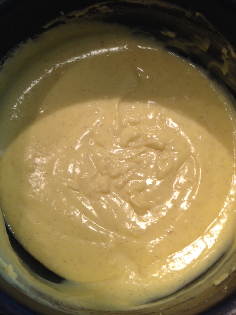 Vaniljekremen lages ved at du deler en vaniljestang og skraper ut frøene med en kniv. Ha dette i en tykkbunnet kasserolle sammen med melk. Gi dette et oppkok og sett til side. Ta ut vaniljestangen. Pisk så eggeplommene godt sammen med sukkeret og maisenna i en egen bolle som tåler varme. Ta så en spiseskje med melkeblandingen over i eggeplommene mens du visper godt. Dette gjentar du en 10 ganger slik at du får temperert eggeblandingen før du heller i resten av melka. På denne måten slipper du at du ender opp med en sprukken vaniljekremmasse. Når du har klart å blande all melka i eggeblandingen, så heller du alt tilbake i kasserollen. Nå skal blandingen varmes opp forsiktig til kokepunktet under stadig omrøring. Ikke bli fristet til å ta en liiiten pause for å sjekke fjesboka eller gå på do. Dette krever full konsentrasjon og blikket festet hardt oppi kasserollen. Nå skal massen gradvis stivne mens du rører og rører. Blandingen skal så vidt koke i 1 min mens du rører som en gal.