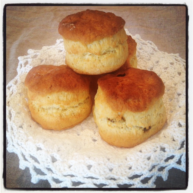 Morgenstund har gull i munn eller noe sånt.. Dette var en av disse søndagene da litt etterlengtet søvn hadde gjort seg, men husets to små hadde tydeligvis lagt andre planer. Oppe før trasten og i strålende humør selvsagt… Selvfølgelig hadde husmora, som fortsatt befinner seg godt inni tett ammetåke, glemt å ta opp brød kvelden før til søndagsfrokosten. Så da stod vi her da, trøtt, trasig og sulten. What to do? Scones!! Denne fantastiske lille bolleaktige saken som lages på null komma niks. Det var det bare å labbe ned på kjøkkenet i nattisen, hive sammen noe i en bolle, stikke ut og rett i ovnen. Null smelting av smør, ingen gjær, null heving, litt søl, men stort sett bare fryd og gammen. Da var det bare å sette seg ned og nyte en god søndagsfrokost lell 😉 God søndag!