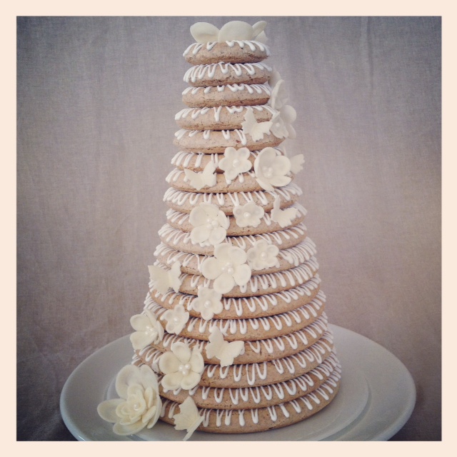 bilde46I helga fyller mannen i huset 40 år og i den forbindelse spurte jeg han om hva slags kake han likte best. Det var vanskelig å plukke ut en favoritt, men kransekaken er nok en av topp 3.  Kransekake har jeg aldri bakt før, så det ble jo en ny utfordring for meg 🙂 Etter en god del søvnløse netter, ikke pga nervøse kransekakebakerykninger, men syk baby, så valgte jeg først å bake med ferdig kransekakedeig. Trøtt og sliten tenkte jeg at hvorfor gjøre alt så vanskelig når det sikkert kan gjøres enkelt?  Men hastverk er jo som kjent lastverk. 2 pakker Odense kransekakemasse skulle til sammen være nok til ca 20 ringer. Ja, i miniputtland, kanskje… For dette holdt som knappast til 15 tynne ringer, totalt. Dette kunne jo jeg ikke servere når jeg skulle lage ynglingskaken hans. Neste morgen våknet småen igjen før trasten nok en gang hadde vurdert å stå opp, så da var det like så greit å få noe ut av dagen. Vi malte mandler og laget kransekakedeig fra bunnen av. Det var ikke så vanskelig, det bare tok litt tid. En liten time senere lå deigen i kjøleskapet klar til å trilles ut. Denne gangen holdt det fint til 18 store, flotte ringer. Kaken ble pyntet så fint jeg bare klarte og håper at den faller i smak hos jubilanten. Gratulerer med dagen, kjære!