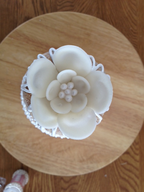 Marsmellowsfondantblomster og sukkerperler. Se 2 etg. sjokoladekake på denne siden for mer info om hvordan lage dette.