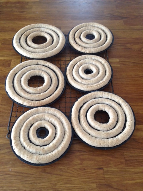 Avkjøl ringene helt før du tar de ut av forma. Pakk de så godt inn i plast og frys ned. Dette skal visstnok hjelpe på at de blir seige og gode. I fryseren kan de ligge helt til du skal montere kaka. Dager, uker og måneder…