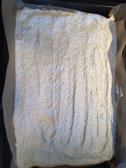 Mal mandlene i mandelkvern (evt. fres de noen runder i blender, men best resultat med kvern). Pisk eggehviter og sukker godt til du har en stiv masse. Skjær inn de malte mandlene med en slikkepott og unngå at du rører ut all lufta fra massen. Vend inn til alt er godt blandet. Ha massen over i en bakepapirkledd, middels stor langpanne, av typen med lokk og håndtak og stek ved 175 grader i ca 10-15 min. (Lokket skal selvfølgelig ikke være på under steking..) Pass på for overflaten skal være sprø og det inni skal være seigt. Her må du åpne luka og kjenne på bunnen. Er overflaten myk, må den stekes lengre. Hold deg ved ovnen og la alt annet ligge. Det er viktig at bunnen blir perfekt!