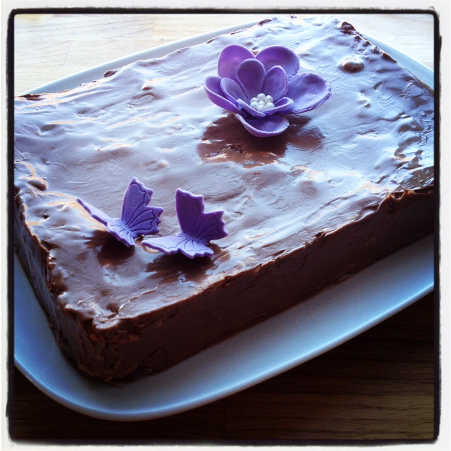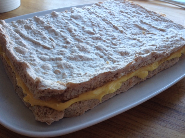 Del kakebunnen loddrett midt på slik at du får to firkanter. Legg så den ene delen med den sprøe oversiden ned på et kakefat. Bre den gule eggekremen over og legg så på den andre bunnen over. Så tar du og heller over den smeltede sjokoladeglasuren og dekker topp og sider på kaken. Sett kaldt til glasuren får satt seg og plutselig er kaken ferdig 🙂