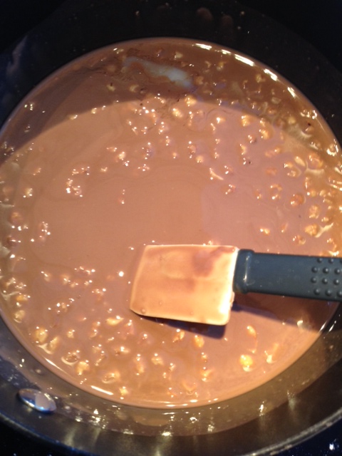 200 gram firkløversjokolade smeltes i en gryte sammen med delfiafett. Rør sammen og avkjøl til romtemperatur.