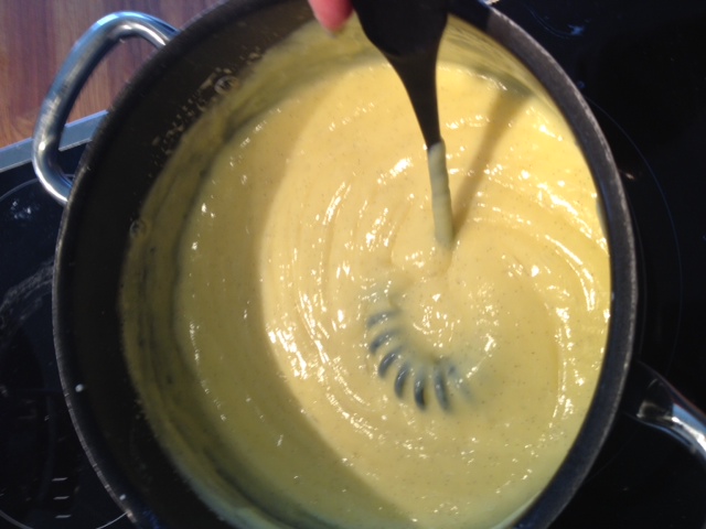 Nå skal blandingen varmes opp forsiktig til kokepunktet under stadig omrøring. Ikke bli fristet til å ta en liiiten pause for å sjekke fjesboka eller gå på do. Dette krever full konsentrasjon og blikket festet hardt oppi kasserollen. Nå skal massen gradvis stivne mens du rører og rører under oppkoking. Ikke la kremen koke, men rør som en gal slik at den blir tykkere uten at det bobler i kjelen. Når den er rømmegrøttykk+ er kremen ferdig.