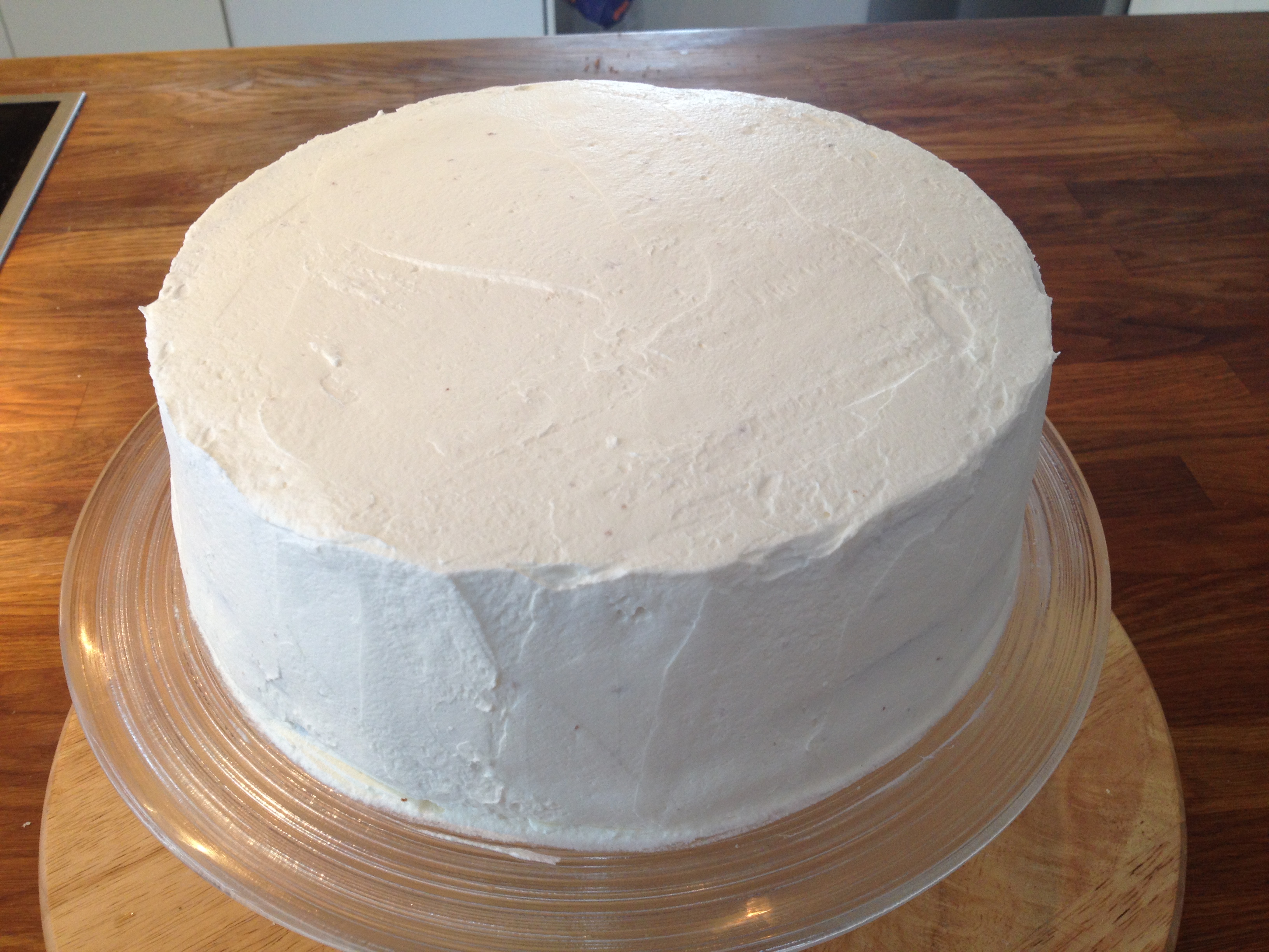 8. Legg på den siste bunnen og trekk hele kaken med resten av fløtekremen. Sett kaldt.