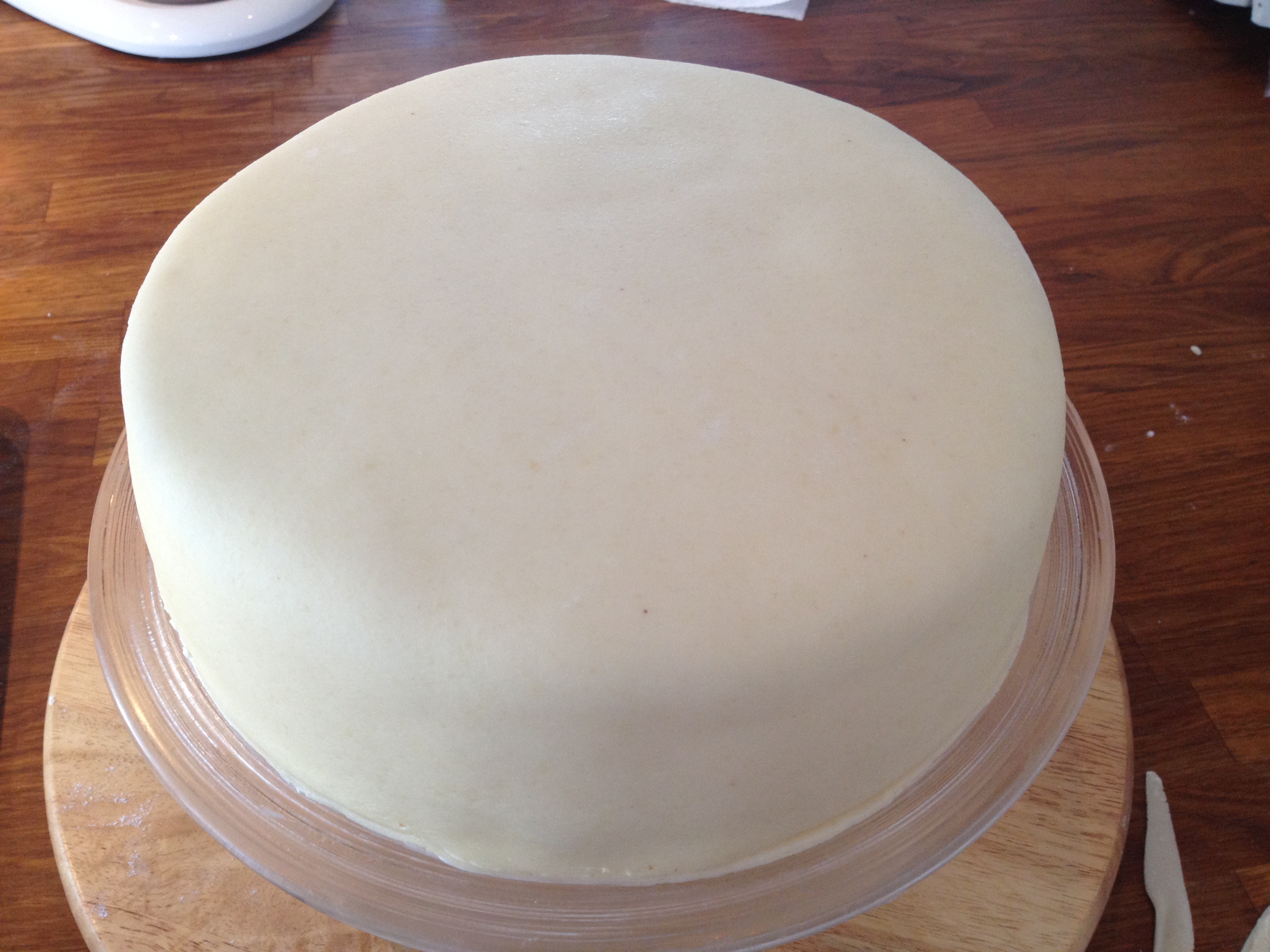 9. Har du et roterende pizzafat så ta dette i bruk og sett kaken oppå med fatet. Det gjør det enklere å trekke kaken pent.  Kjevle ut marsipanlokket og kost av evt overflødig melis før du løfter dette forsiktig over kaken. Pass på at det er mer enn nok marsipan nede langs sidene. Start øverst og jevne ut toppen av kaken. Pass på å få ut evt. luftbobler. Bruk en smoother eller håndflatene. Så starter du øverst på sidene av kaken. Jobb marsipanen inn mot kaken med en lett hånd, snu kaken rundt mens du jobber. Strekk forsiktig utover i marsipanen mens du jobber deg nedover på kaken. Da unngår du at den bølger seg. Det er her det ofte går galt om lokket er kjevlet for tynt. Da vil det lett revne og legge seg i bølger. Når du da til slutt har jobbet deg rundt og nedover langs kaken, lager du en kant nederst  på ca. 1 cm ut fra kaken og skjærer overflødig marsipan  bort med en pizzaskjærer.