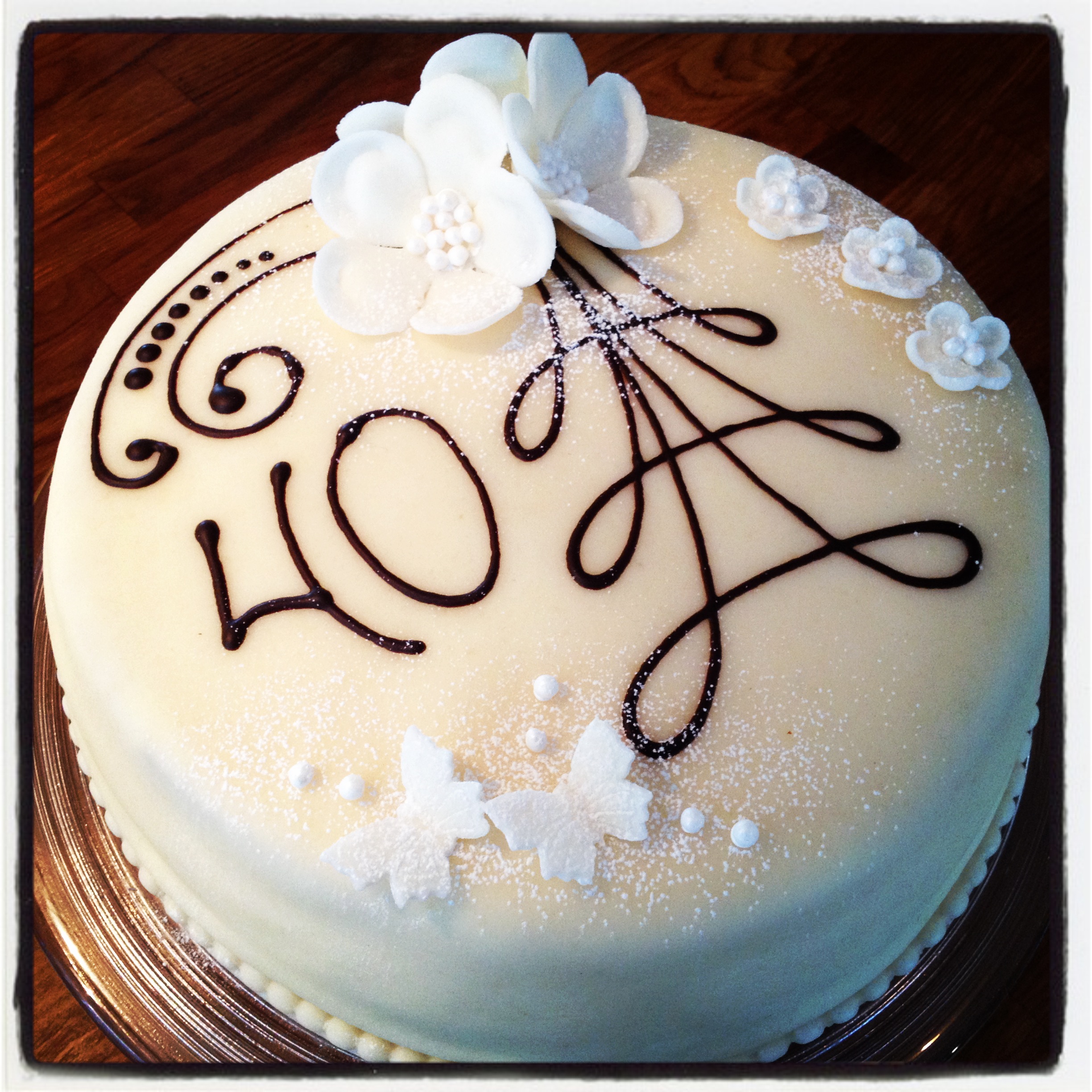 Smeltet kokesjokolade og fondantblomster, men her kan du bruke hva du vil av f.eks. krem, sjokolade og bær.