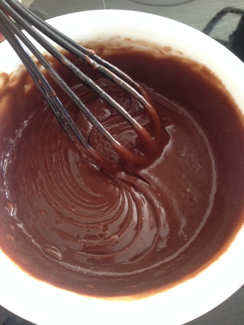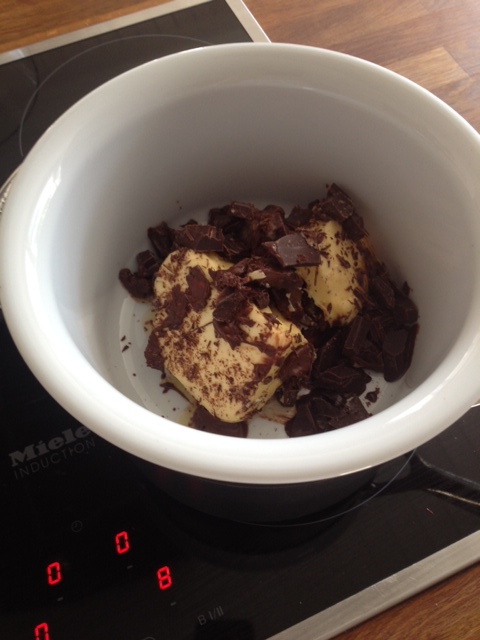 Ta så smør og grovhakket sjokolade og smelt dette i en bolle over vannbad. Pass på at det ikke kommer vanndamp opp i sjokoladeblandingen da det da blir bare kluss og du må starte på nytt igjen. Synd og skam å kaste så god sjokolade, så pass på!  Når denne sjokolade- og smørblandingen er jevn og fin, tar du den av varmen.