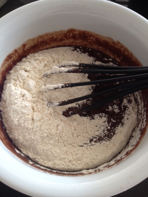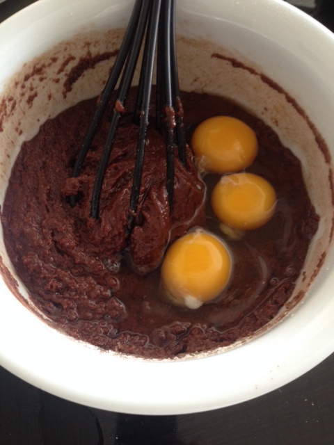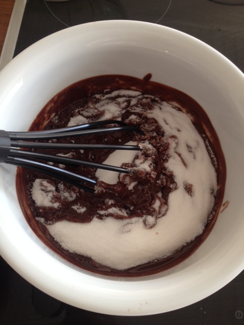 Tilsett så sukkeret og rør godt til det er blandet inn med en visp. Etterpå så gjør du det samme med siktet hvetemel. Til slutt så tilsetter du eggene og rører de godt inn til blandingen er seig og jevn.