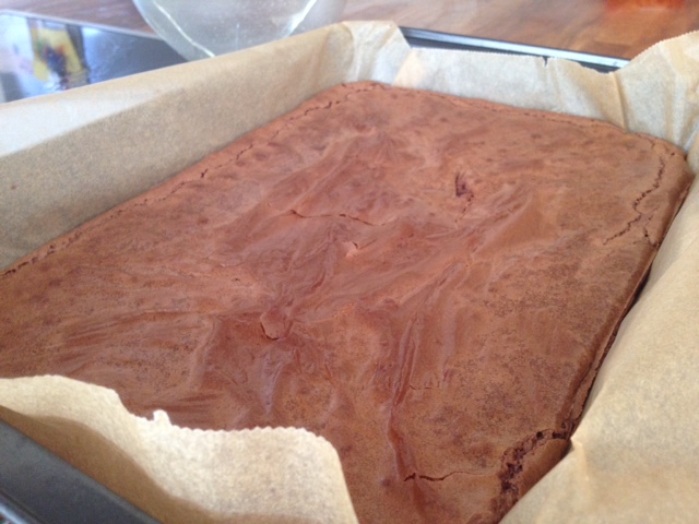 Ha så røren i en bakepapirkledd LITEN langpanne. Sånn ca 30 X 23 isj…
