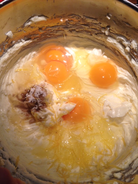 Og det neste man skal gjøre er å ta 4 romtempererte kremostpakker i en bolle/kjøkkenmaskin sammen med creme fraiche. Røres jevnt og klumpfritt med maskina eller miksmaster. Tilsett så sukker, egg, vaniljesukker og saft og skall (raspet og kun det gule) av en halv sitron. Rør godt til alt er blandet og ha dette i springformen over den nå avkjølte bunnen. Stek midt i ovnen i ca. 35-45 min på 140 grader. Kaken er ferdig når den har stivnet noen cm (ca. 3-4) fra kanten og inn, mens midten fortsatt disser. OBS! Skal ikke være flytende, men en smule festet men fortsatt dissende. Tenk karamellpudding. Kaken vil stivne når den blir avkjølt. Avkjøl.
