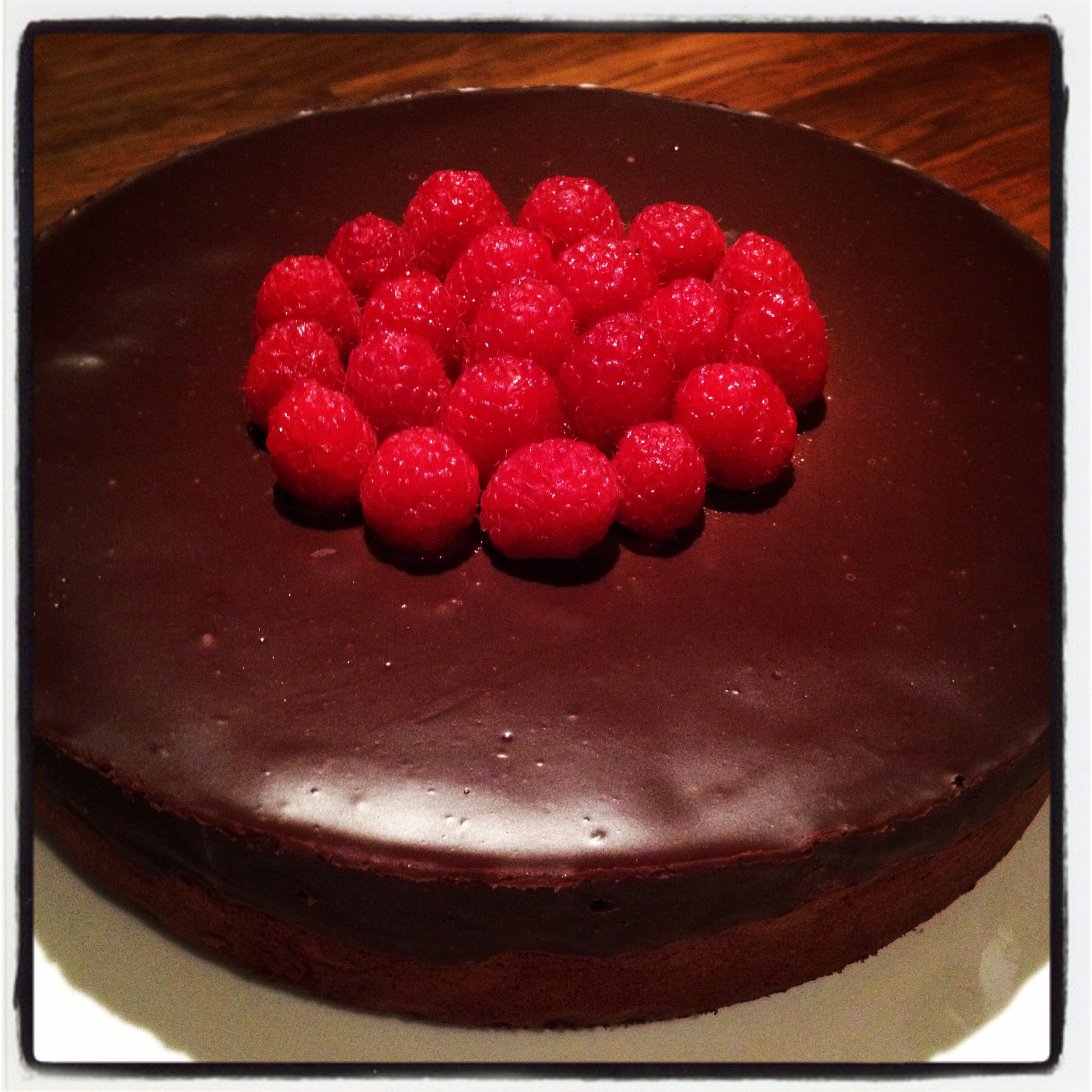 Hell så glasuren over den avkjølte kaken, som fortsatt befinner seg i formen. Sett kaken i kjøleskapet til glasuren har stivnet. Kan som sagt lages 1-2 dager i forveien. Husk bare å temperer kaken før du serverer den. Deles opp med en skarp kniv og server gjerne med friske bær.