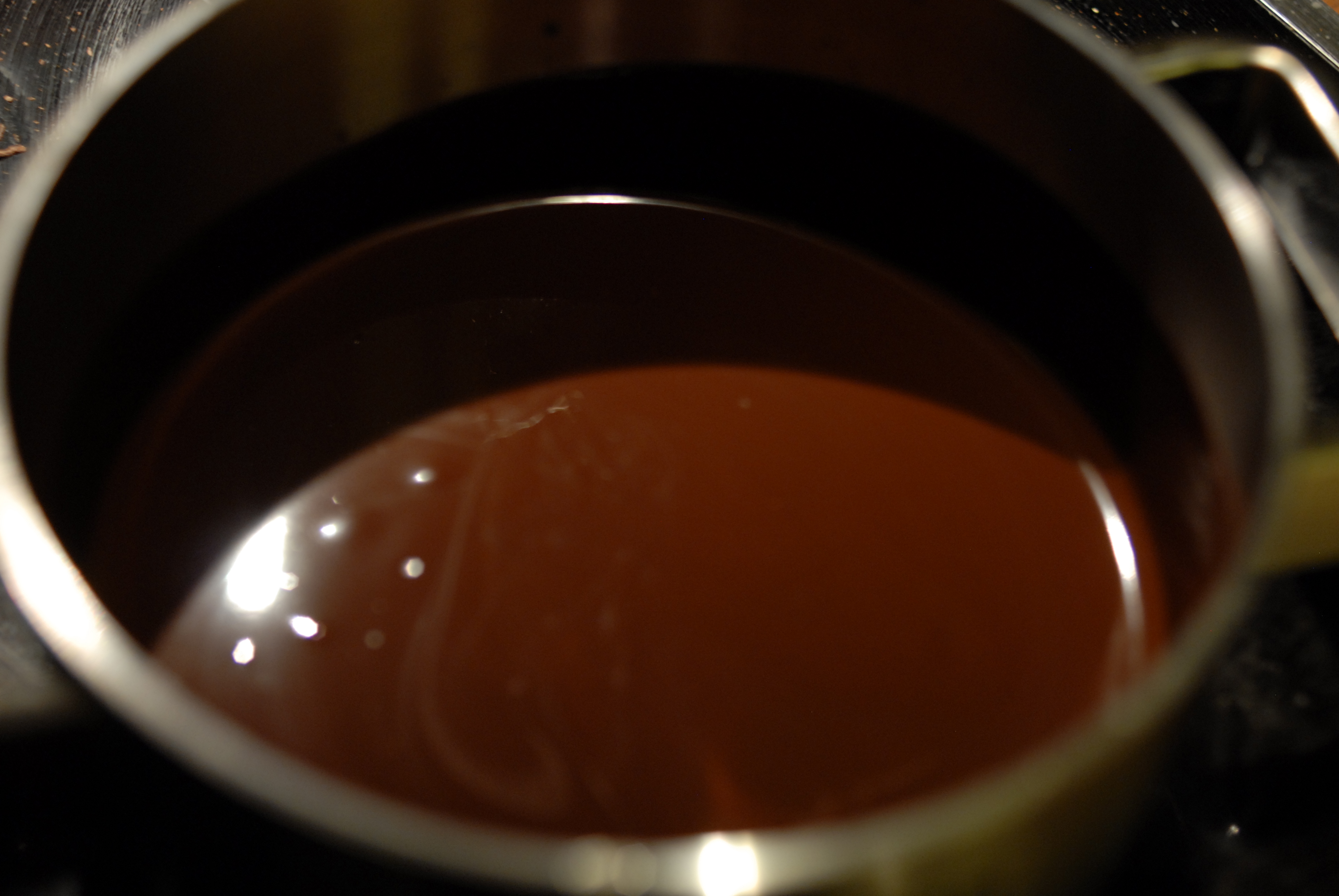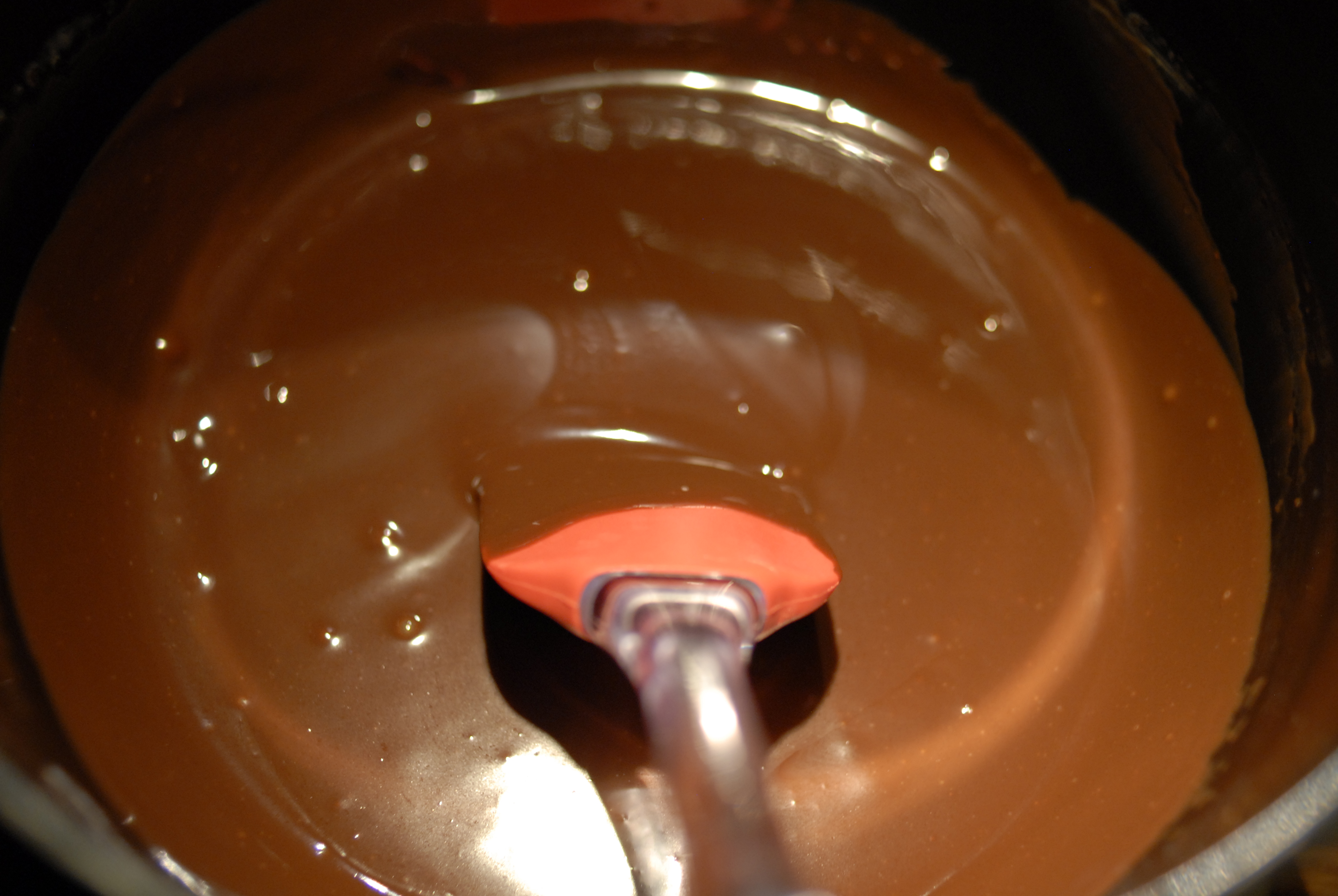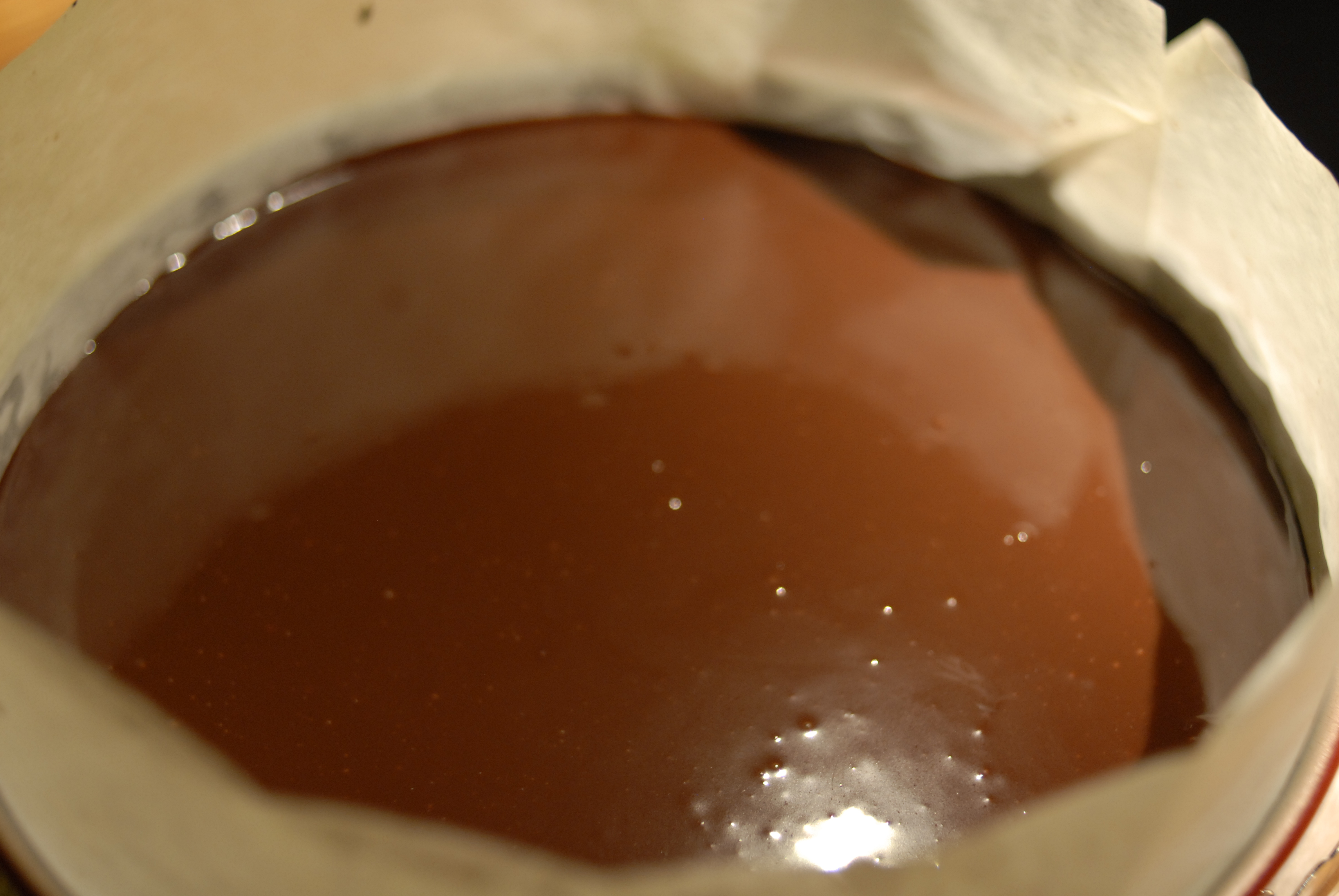 Nå er det glasurtid. Finhakk sjokoladen og ha denne over i en bolle. Gi fløten et raskt oppkok under omrøring og hell denne over sjokoladen. La stå i et min eller to før du begynner å røre. Ikke rør for fort, for vi vil helst unngå for mye luftbobler i glasuren.