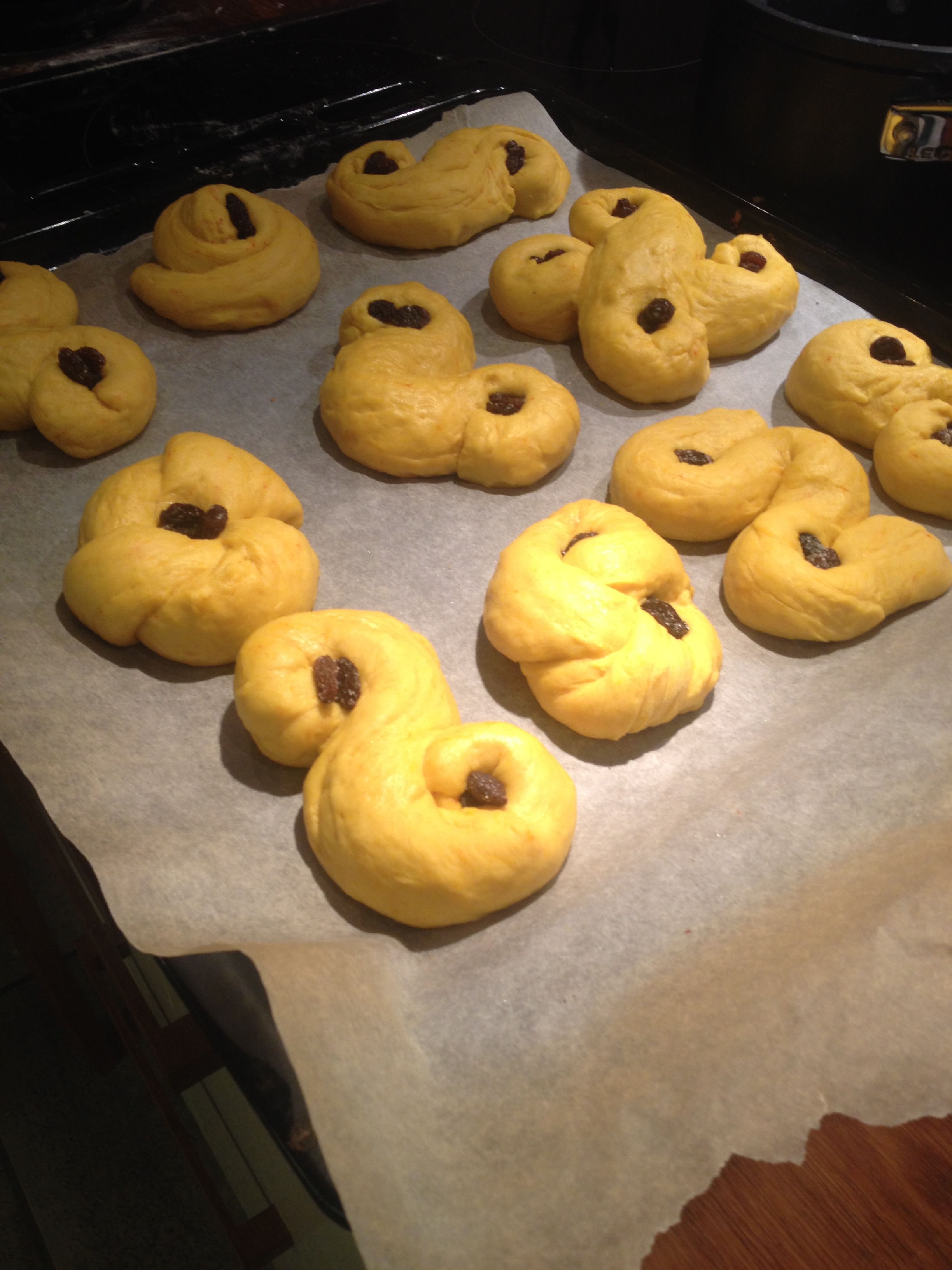 Når deigen er ferdighevet, hvelver du den ut på et bakeunderlag og starter lussekattprosessen med å lage fine snurrer av alle slag. Etter at kreativiteten har fått fullt utløp, legger du lussekattene på bakepapirkledd steikebrett og dekker til med et klede.