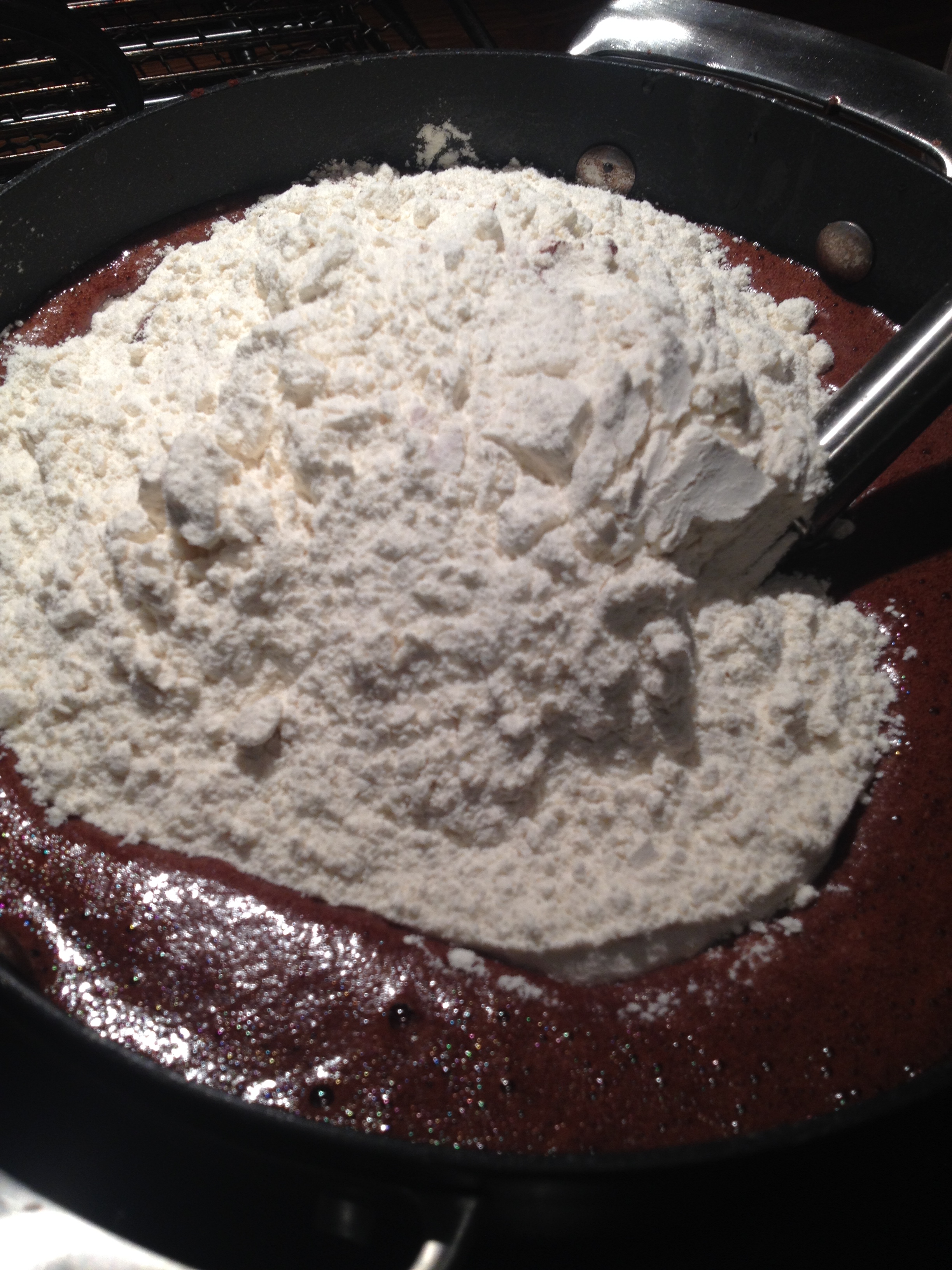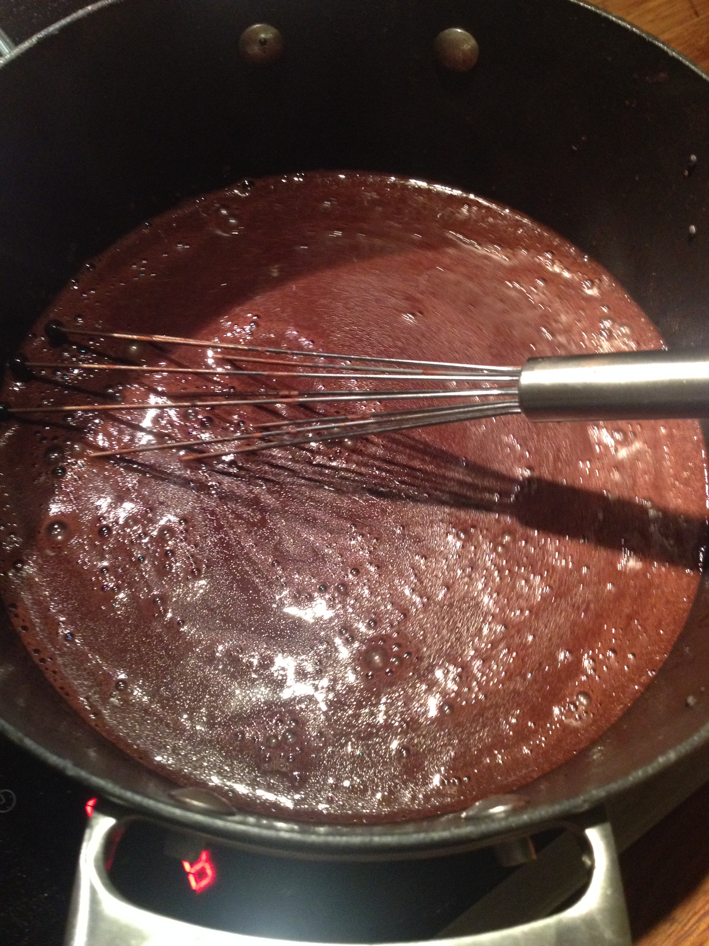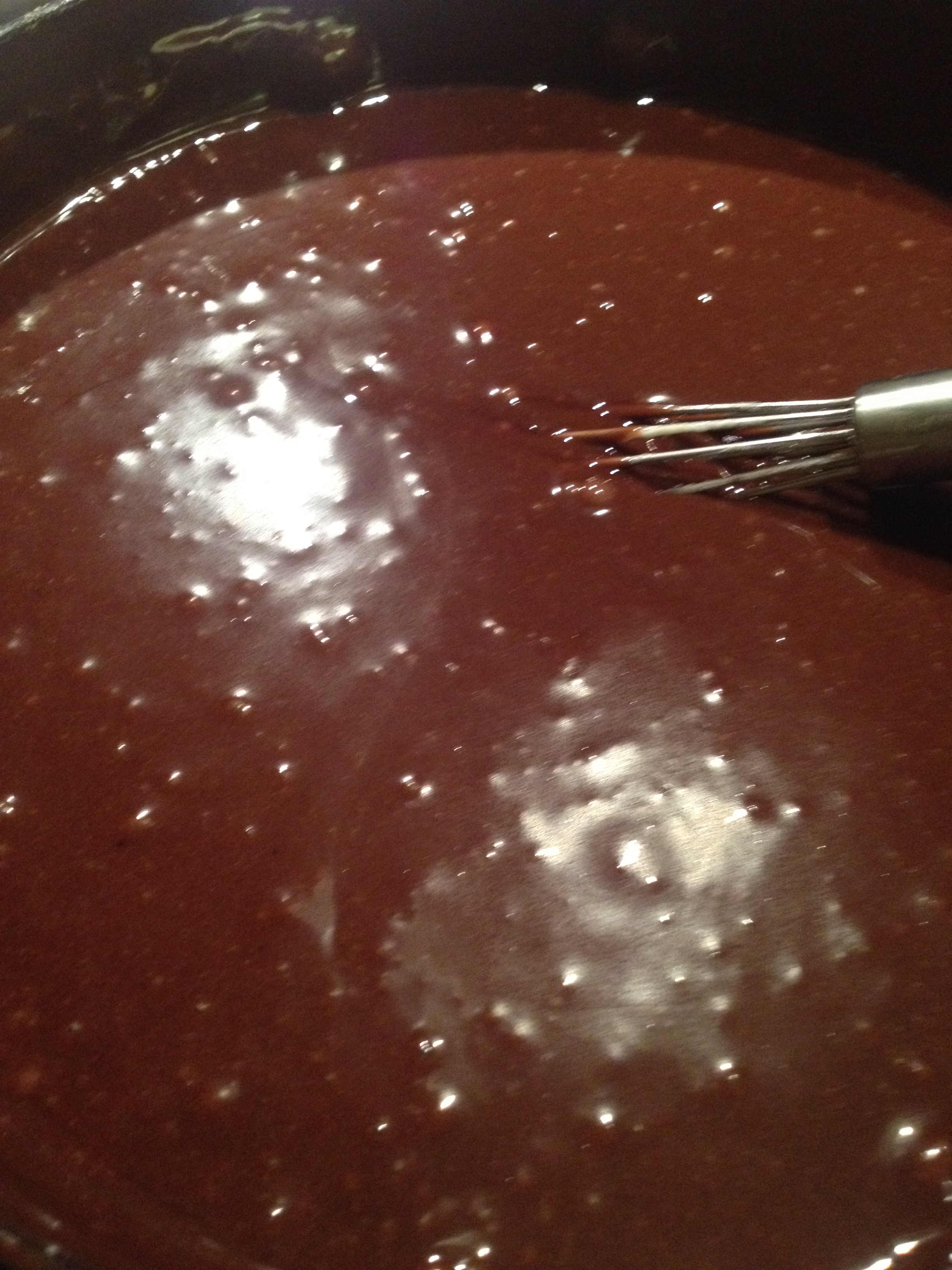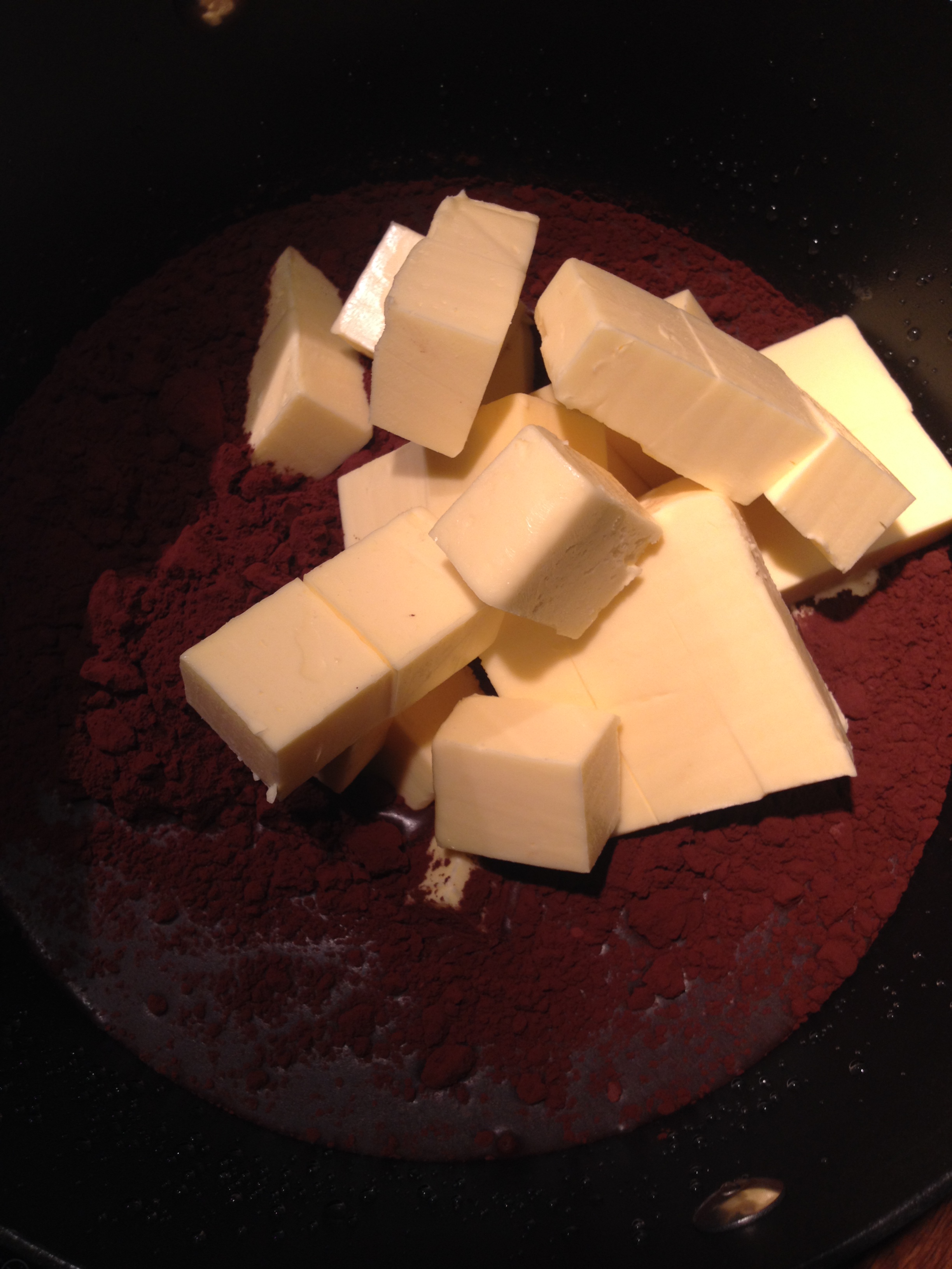 Ha smør, kakao og vann i en stor kasserolle. Varm opp til alt er smeltet og klumpfritt.