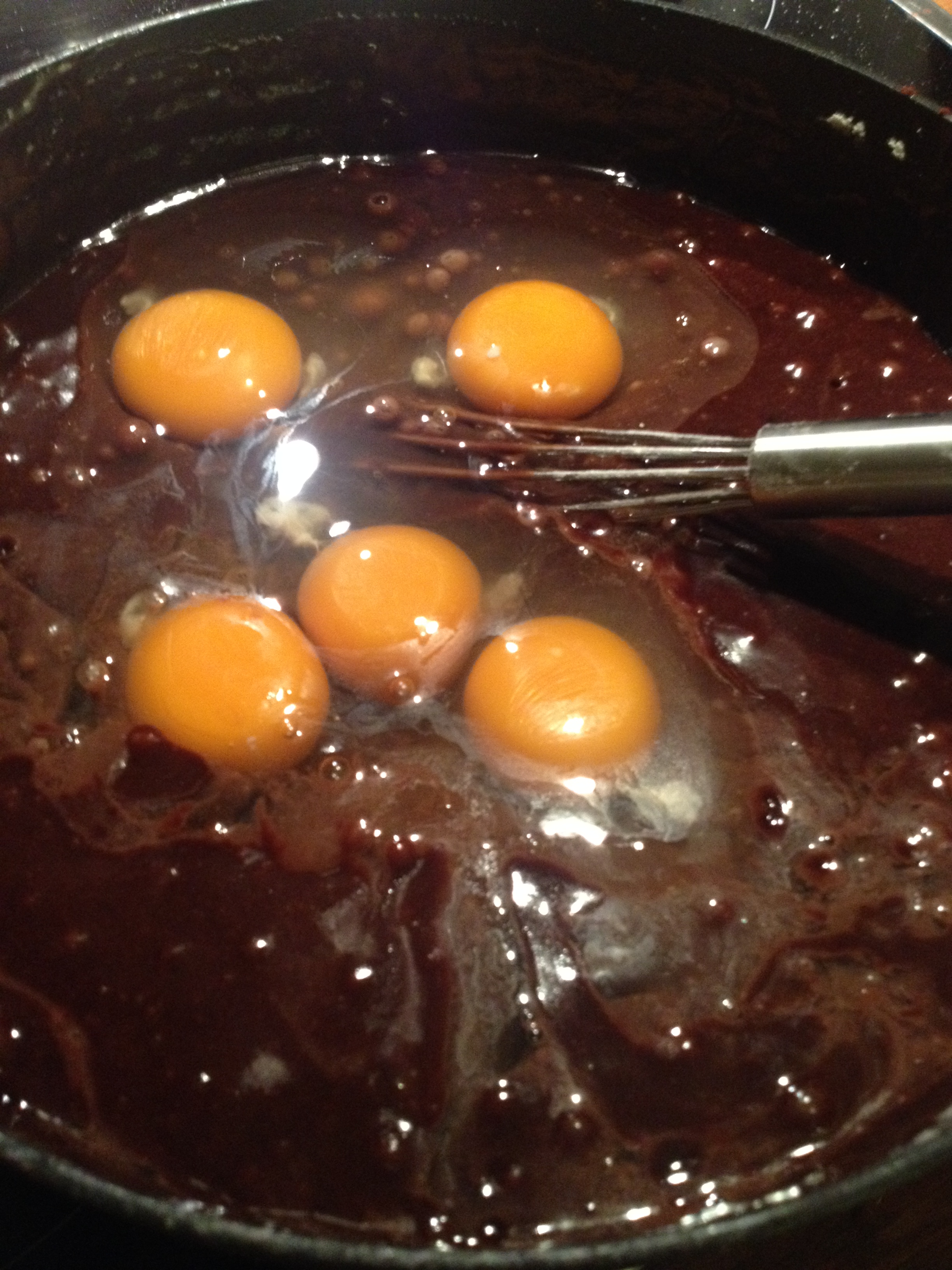 Når du har fått en glatt og fin sjokoladeblanding, tilsetter du 2 ts espressopulver og rører det inn. Ta kasserollen av platen og rør godt inn et egg. Avkjøl litt på benken i noen minutter.