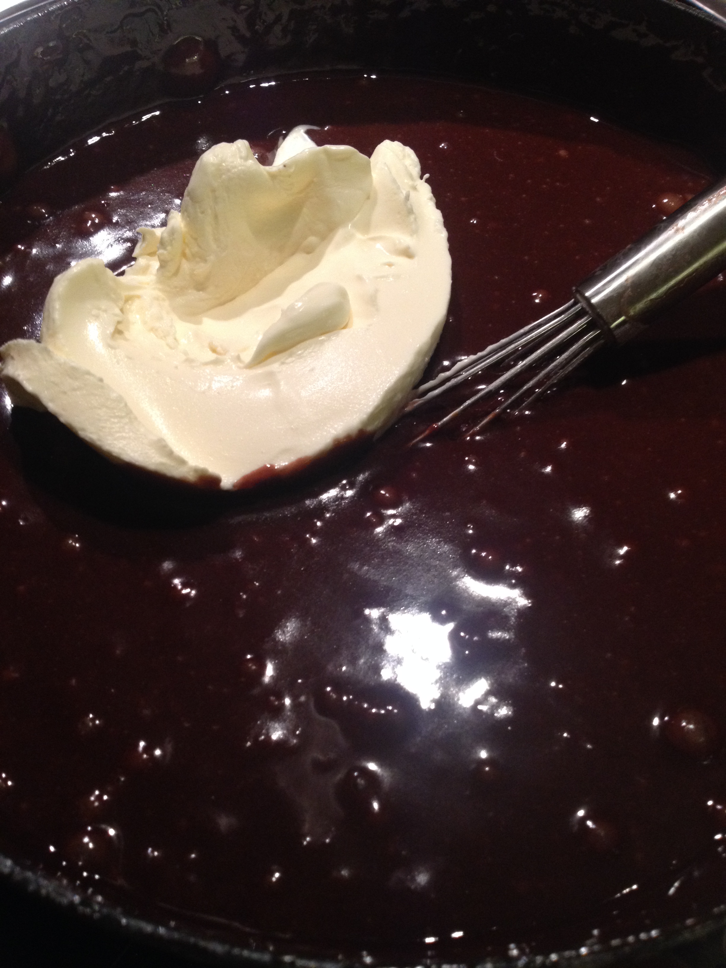 Miks til alt er godt blandet, men ikke for lenge. Smøres straks på kaken og sett kjølig for at glasuren skal sette seg.