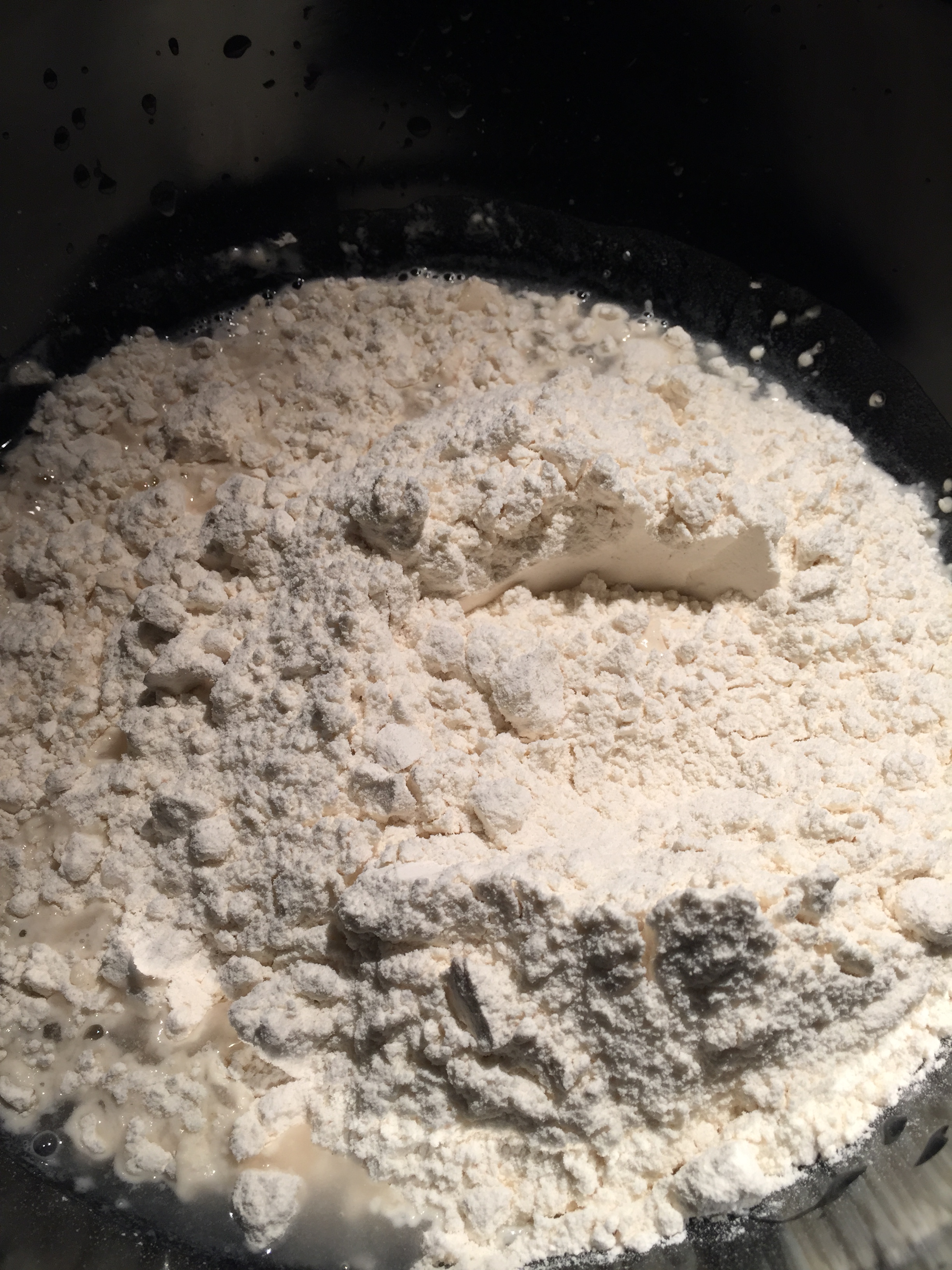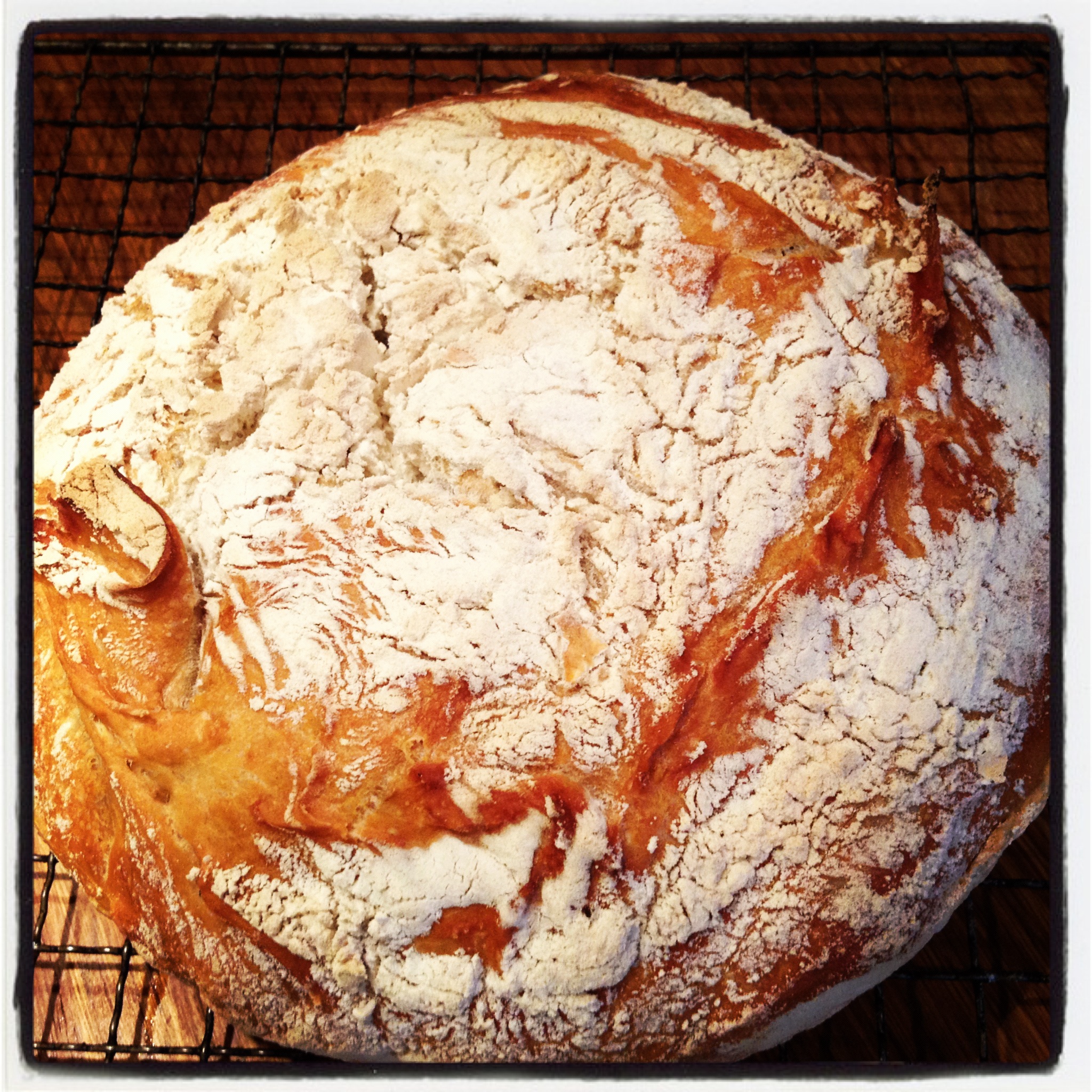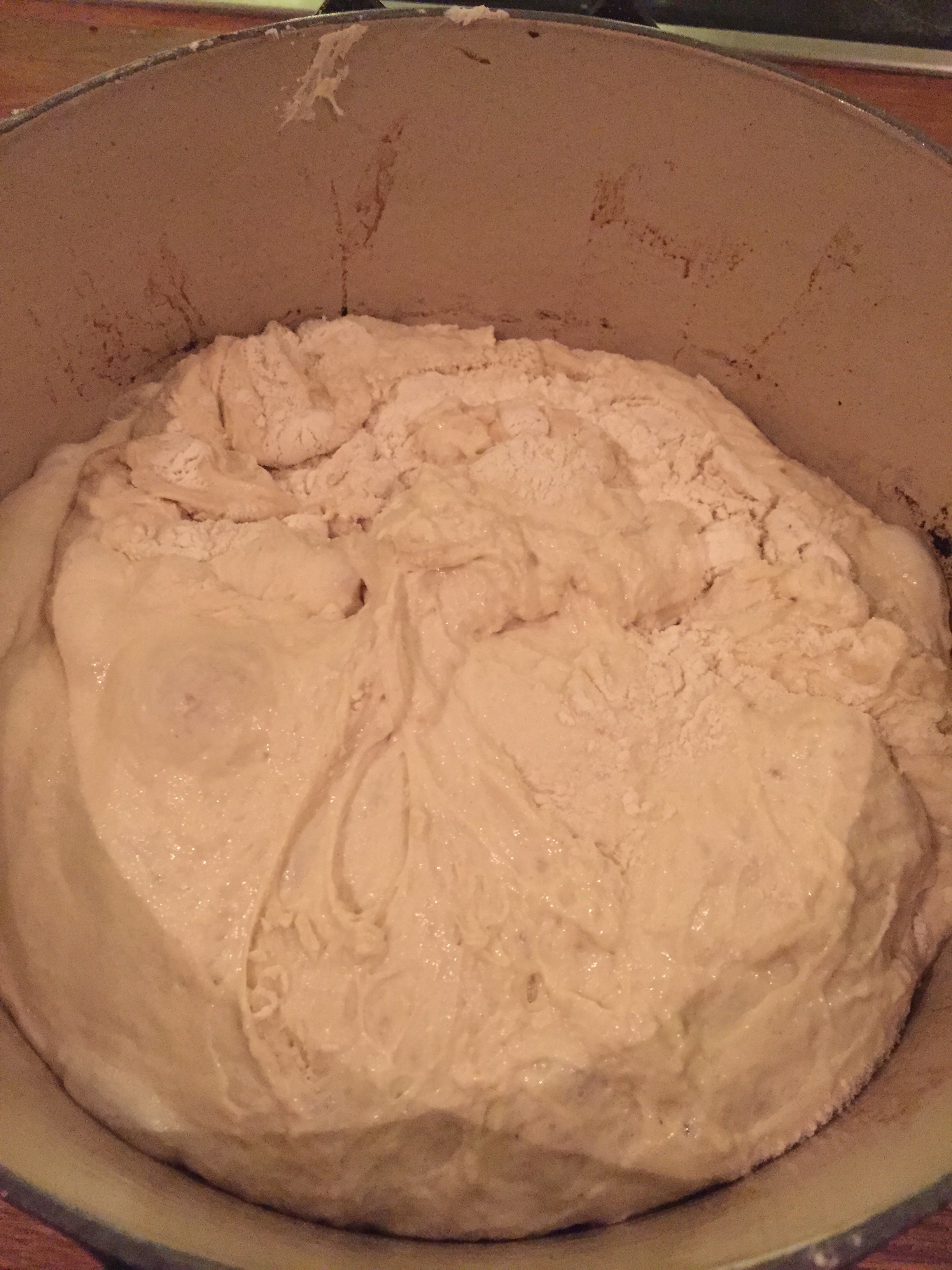 En ny uke uten kake er snart omme, og brødbakingen når nye høyder. Jeg skal ærlig talt innrømme at noen brødbaker, det har jeg aldri vært. Enten blir de for tunge, for grove, for rå eller for smuldrete. Så derfor har jeg latt den siden av bakeverdenen ligge litt på is. Helt til nå. Endelig har jeg skjønt mye grunnleggende ved brødbaking og synes det nå er gøy å prøve ut forskjellige typer brød samt å eksperimentere med egne oppskrifter. Denne ukas go`bit til dere blir eltefritt grytebrød. Nydelig sprø skorpe, luftig og mykt inni. Til tross for veeeeeldig lang forberedelsestid, så kreves det minimalt med arbeidsinnsats. Så det gjelder bare å komme på dagen i forveien at du skal bake og så er det meste egentlig gjort. Hiv mel, vann, salt og bittelitt gjær i en bolle og rør rundt et par ganger. Voilla!! Ferdig deig 🙂 Råtte enkelt rett og slett. Og så var det derre med ventinga da… Ikke noe brød for utålmodige og sultne sjeler dette her altså, men den som venter på noe godt, venter ikke forgjeves! Det kan jeg love 🙂