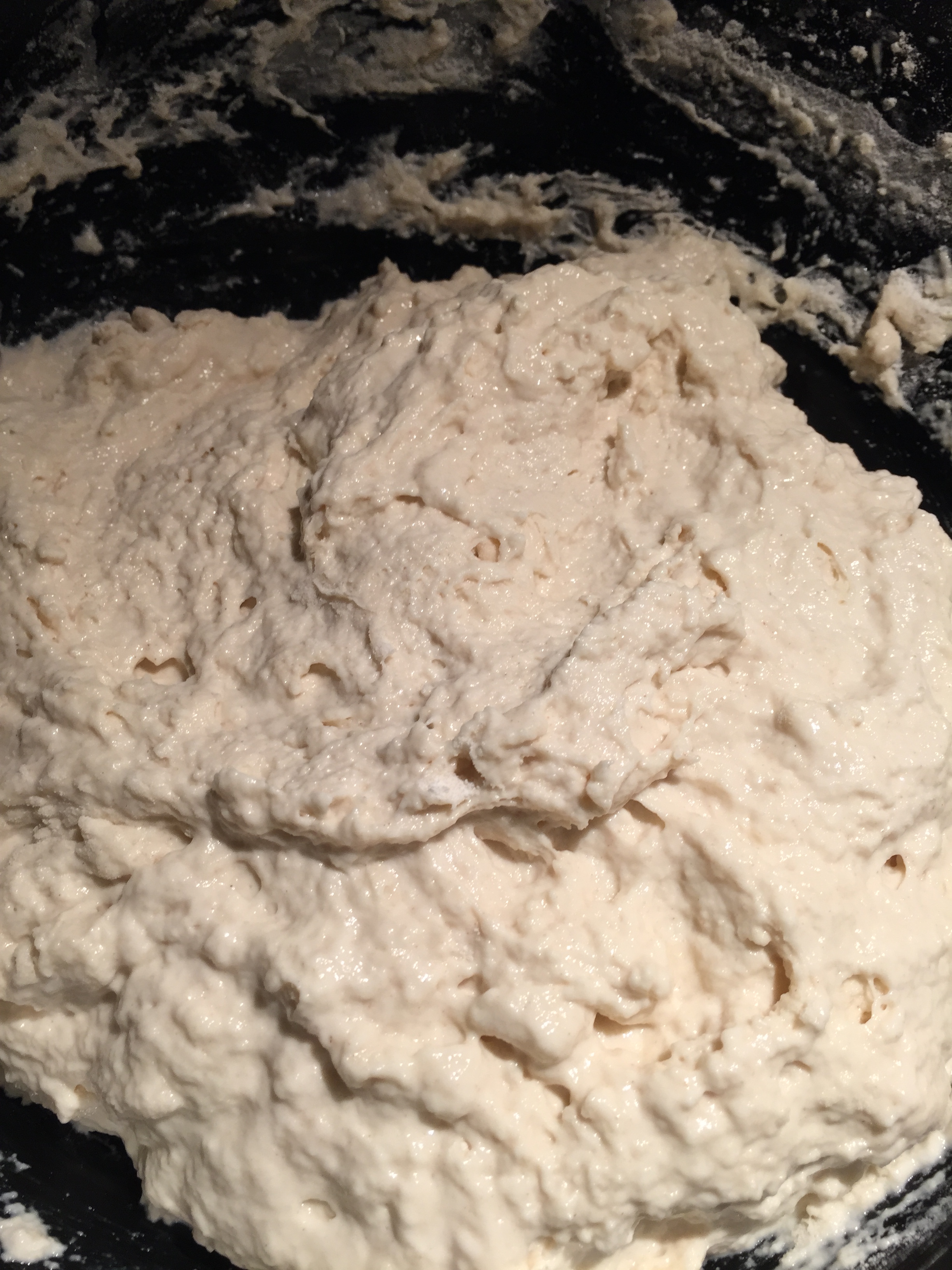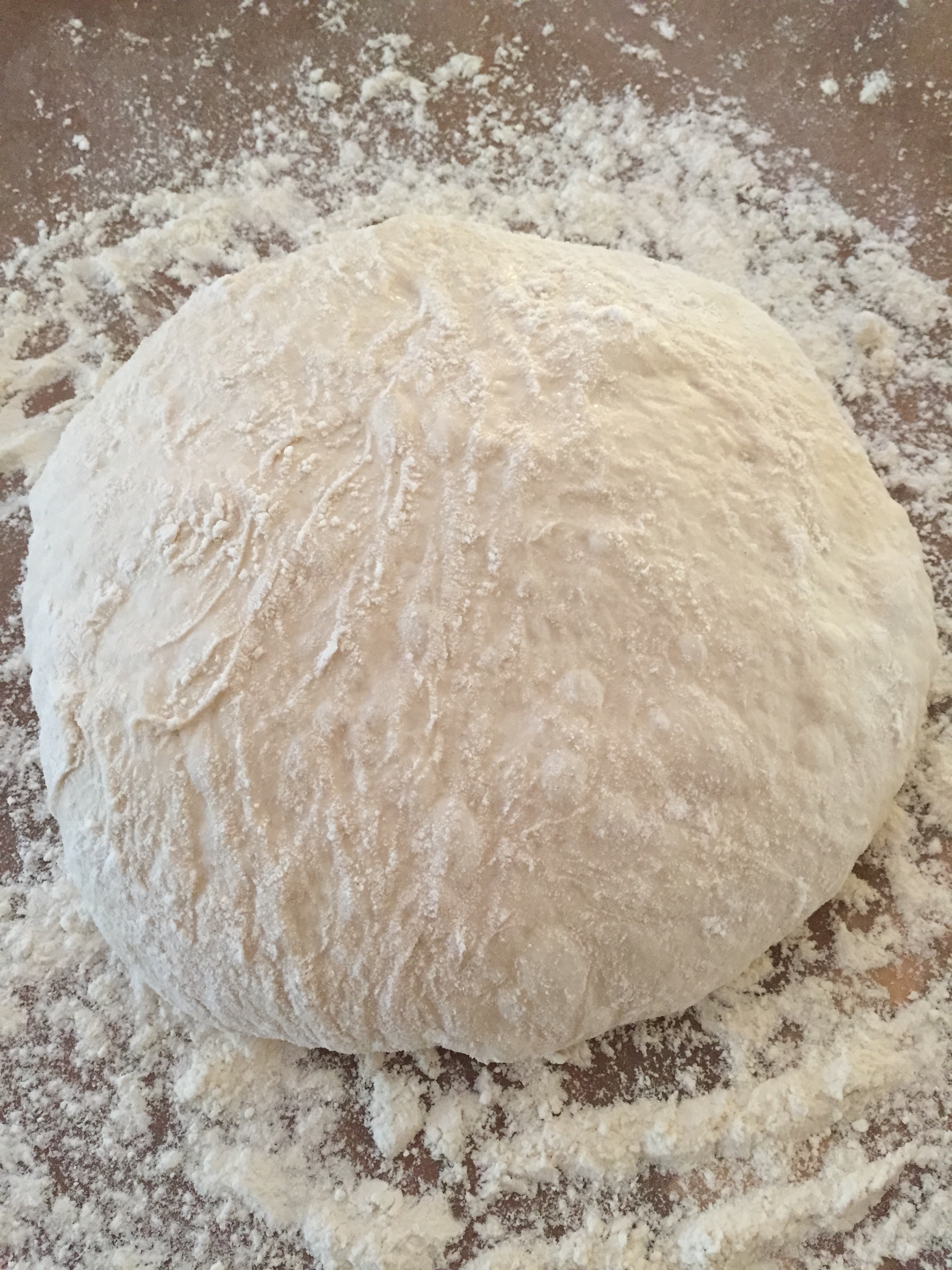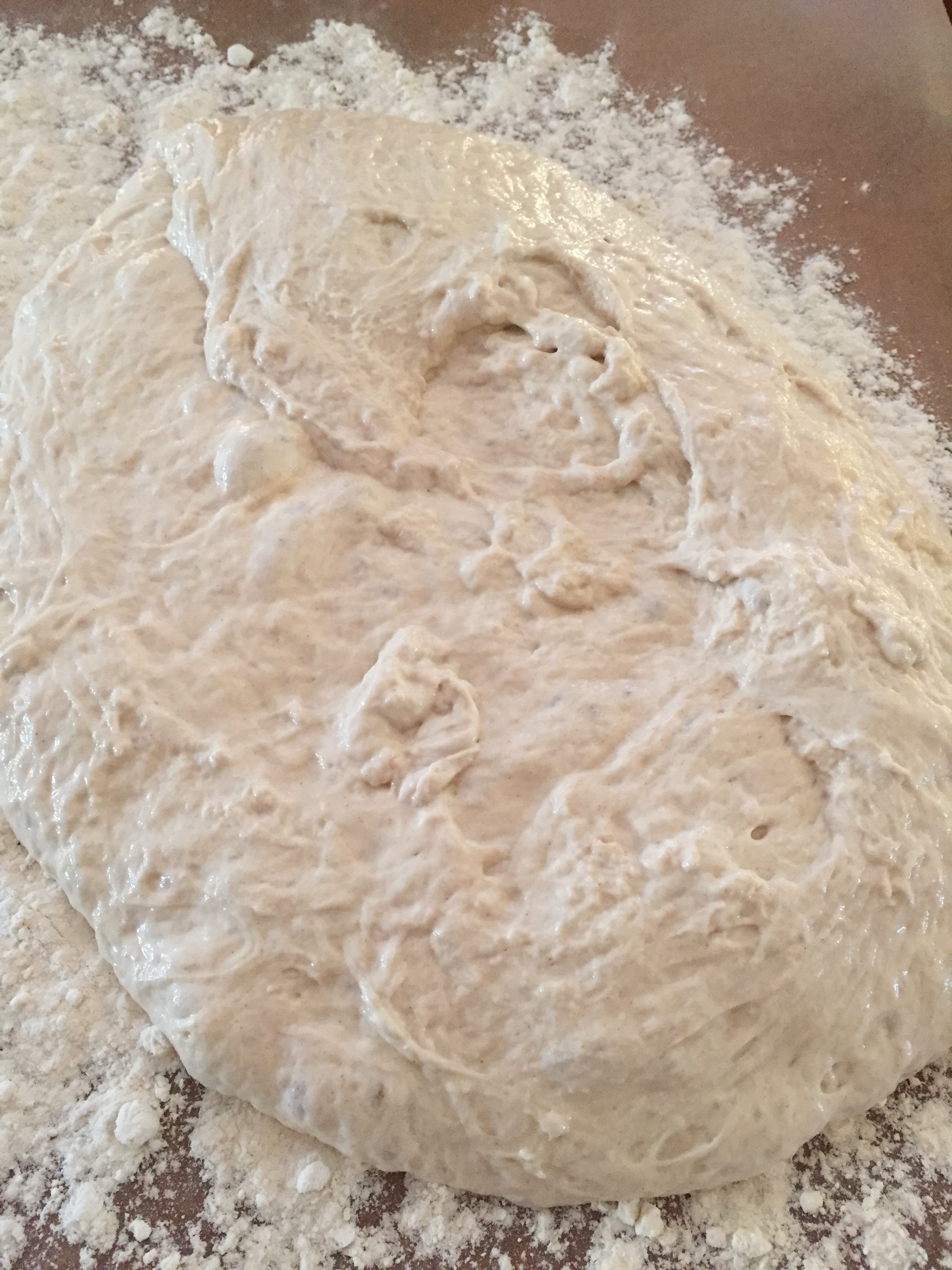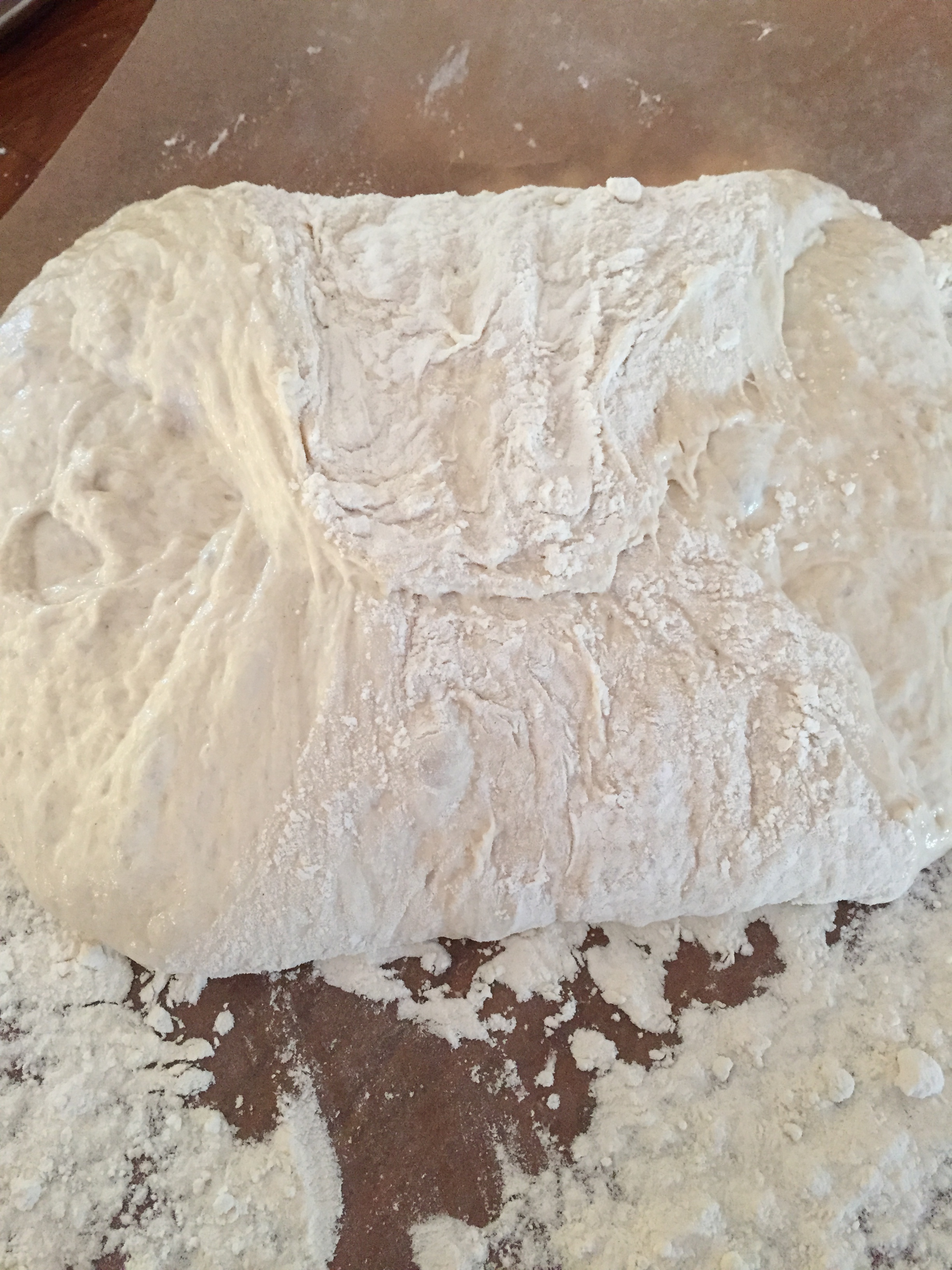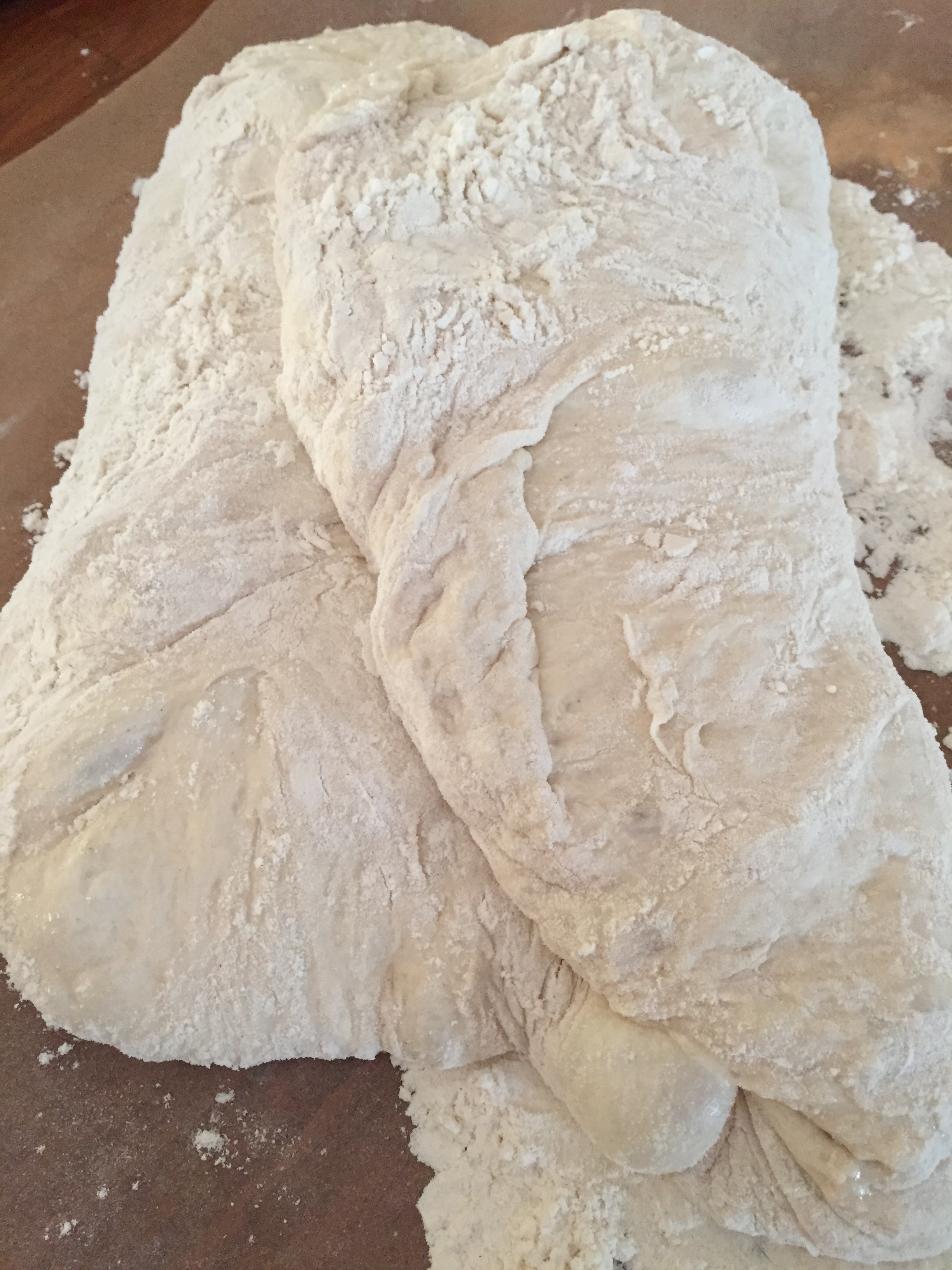 Hell så deigen over på bakepapiret og hjelp det siste i bollen ut med en slikkepott. Deigen er rimelig så utflytende. Nå skal du begynne å brette den. Ta en slikkepott eller deigskrape og brett deigen inn mot midten. Gjenta så fra den andre siden. Så tar du å bretter nok en gang fra de sidene som til nå ikke har vært brettet og bretter de inn mot midten. Gjenta et par ganger til du har fått en fastere deig som begynner å holde på formen.