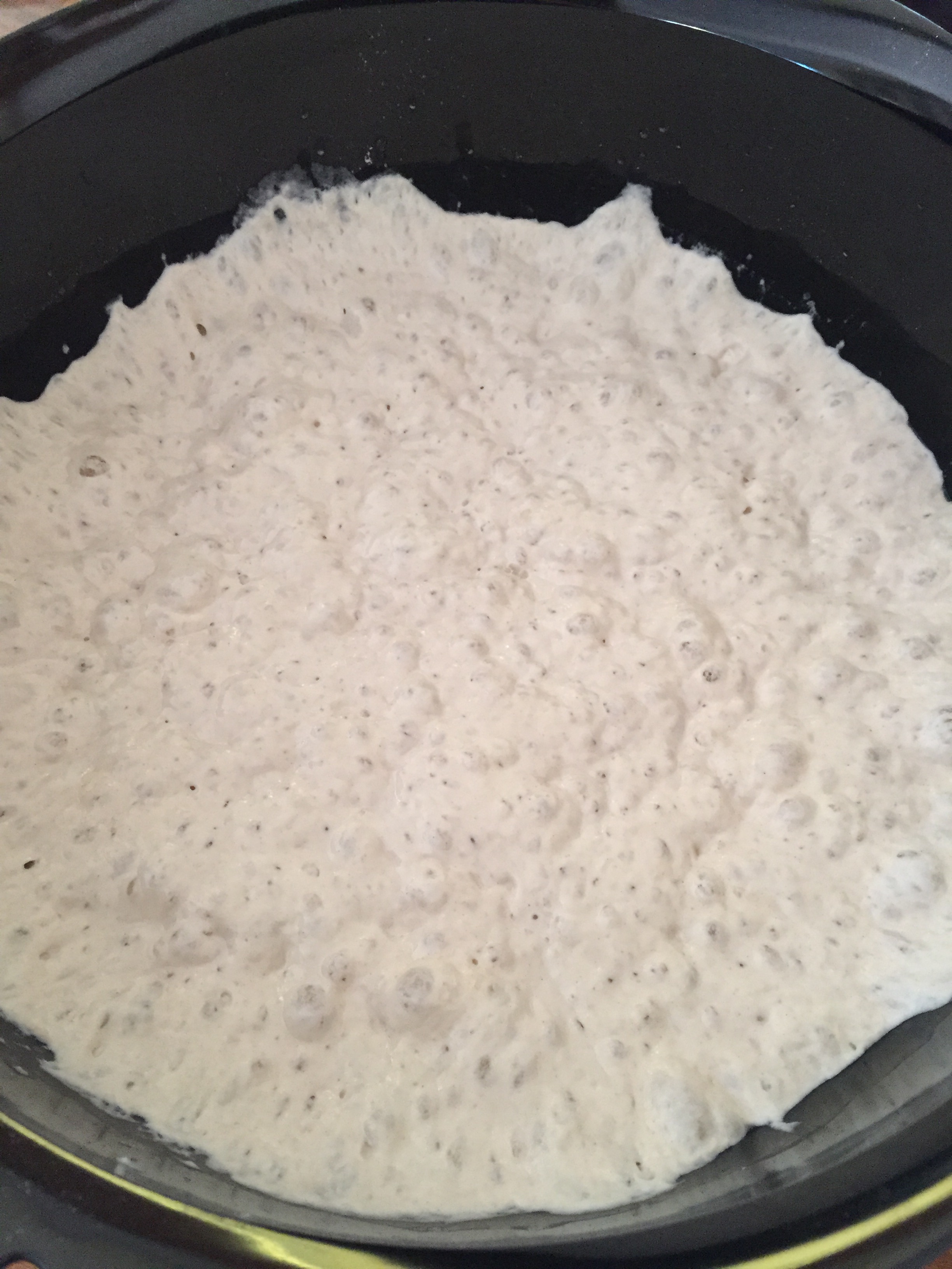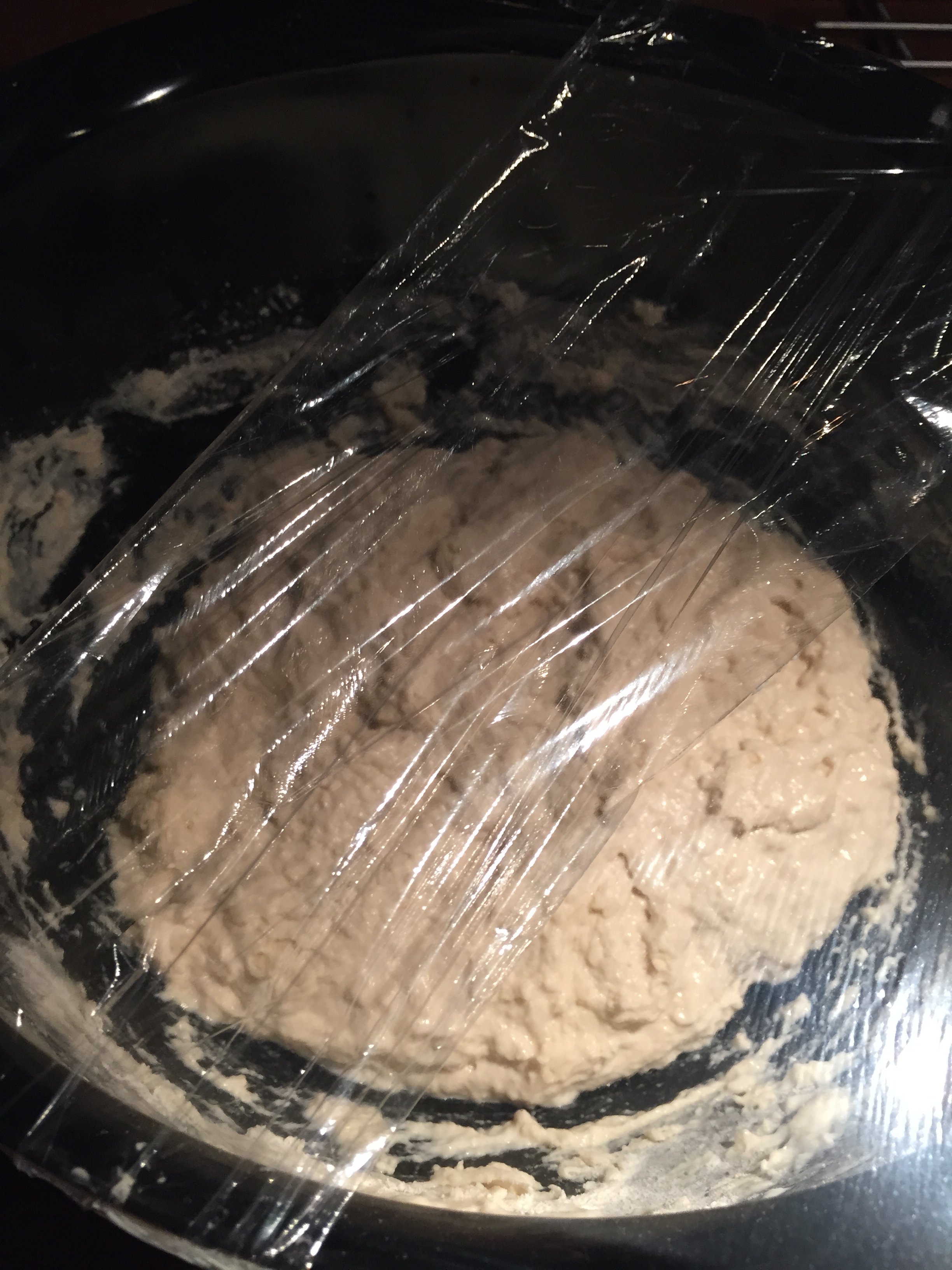 Ha litt av det kalde vannet i en stor bolle og løs opp gjæren i dette. Bruk fingrene. Til sett så resten av vannet samt alt det tørre inkl. frø om du ønsker mer smak i brødet. Rør rundt til alt er blandet. Ca. 1 minutt. Dekk bollen med plast og et klede over der igjen. Sett på benken helst i 12-18 timer. Har sjekket etter 8 timer, og det har fungert det også.