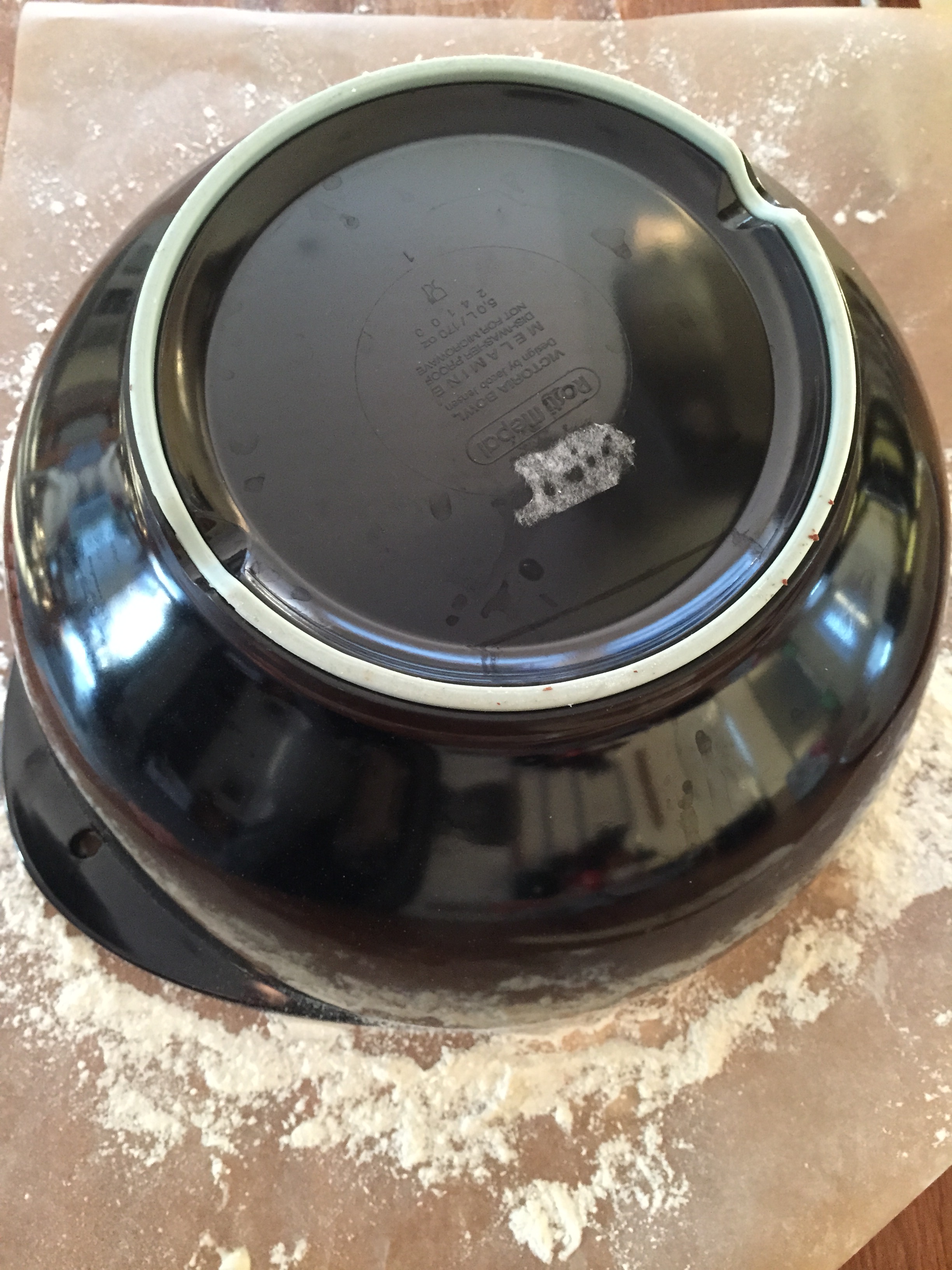 Nå strør du godt med mel på et nytt bakepapir og legger deigen, med skjøtesiden ned, oppå bakepapiret. Sett bakebollen over og la så heve i nye 2 timer. Har du ikke så lang tid, så går det også bra med 1 time.