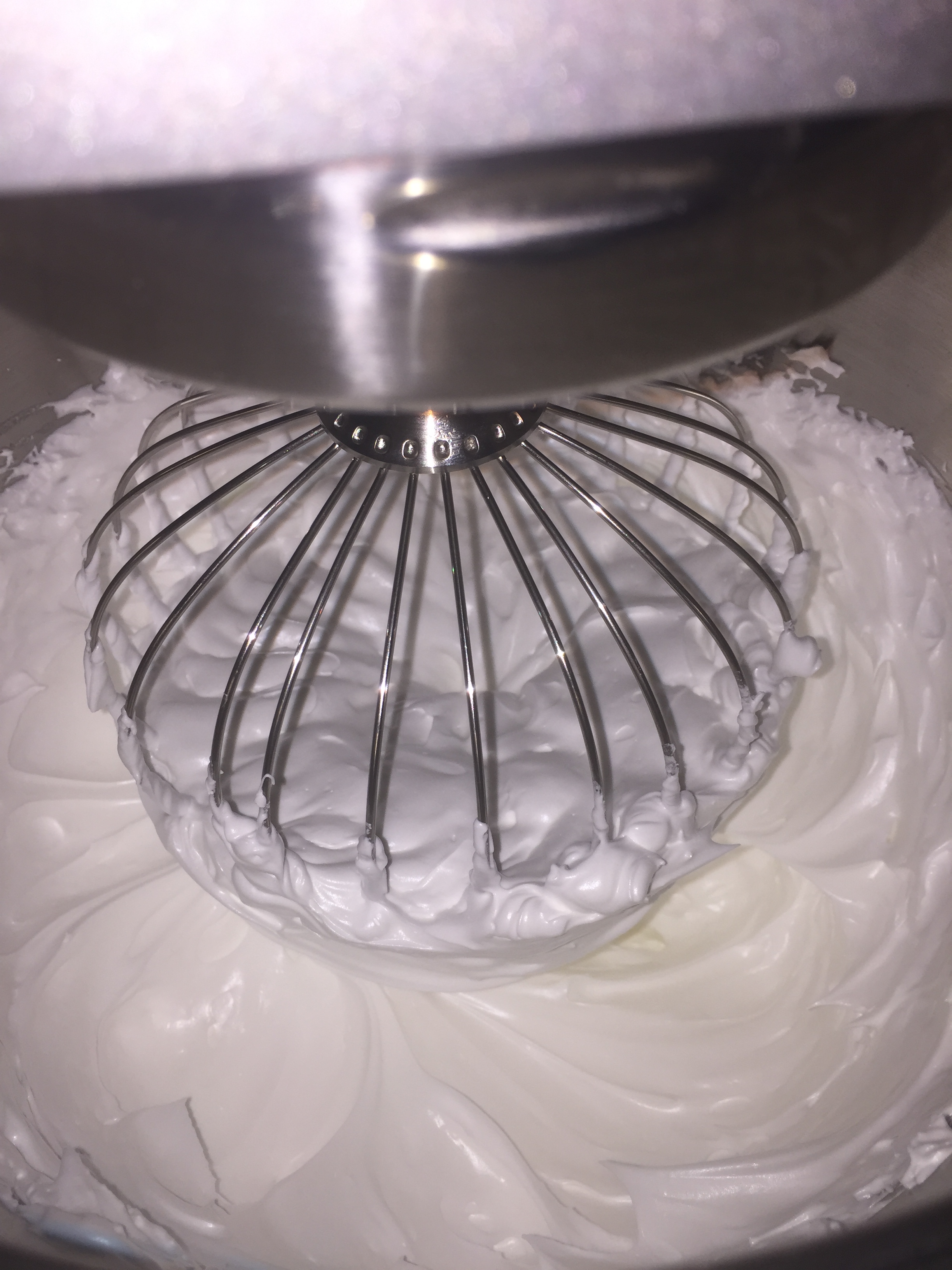 Så tar du eggehvitene og pisker de først på middels tempo i en kjøkkenmaskin/miksmaster. Etter et par minutter kjører du opp tempoet mens du litt etter litt tilsetter alt sukkeret. Det funket dårlig for meg å lage en god marengs i en miksmaster med stativ, så jeg måtte lage en ny i kenwooden for å få inn nok luft. Har du ikke en kjøkkenmaskin, miks med håndholdt miksmaster. Da har du mye mer kontroll med konsistens. Stopp når marengsen er fast, blank og jevn. Når du kan snu bollen opp ned uten at innholdet rører på seg, da er den ferdig. Fordel marengsen over bunnen i langpanna og strø over mandler om du ønsker det.