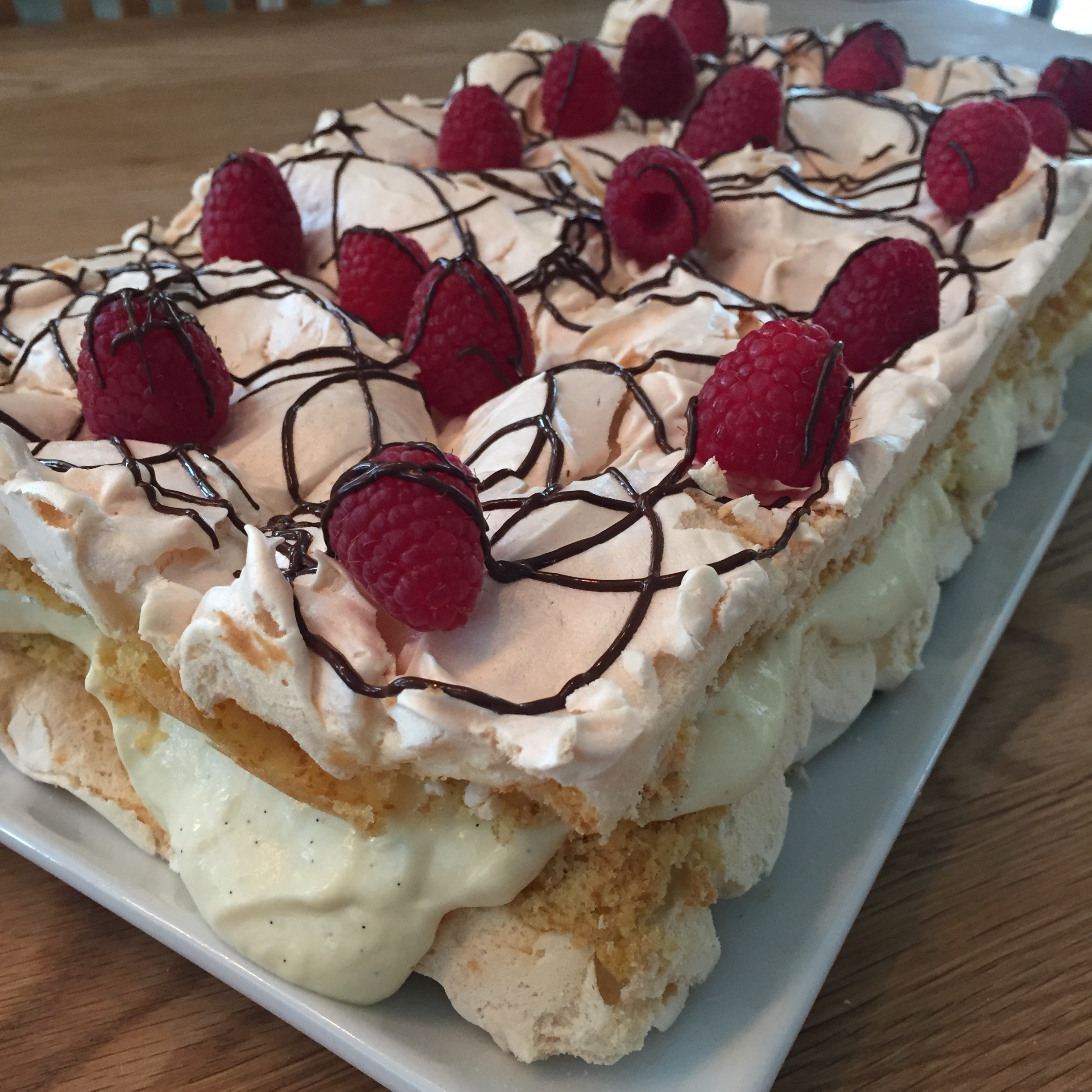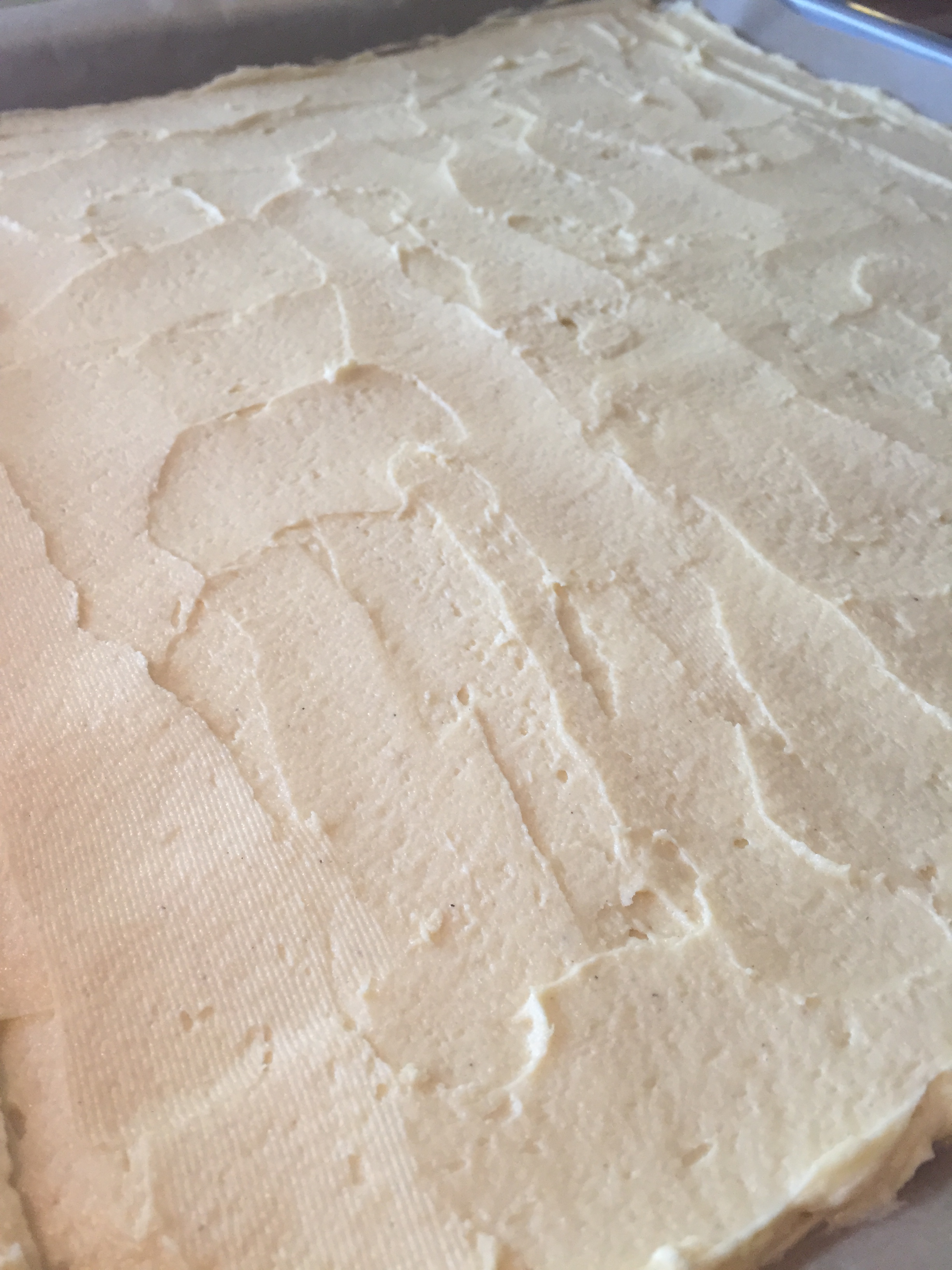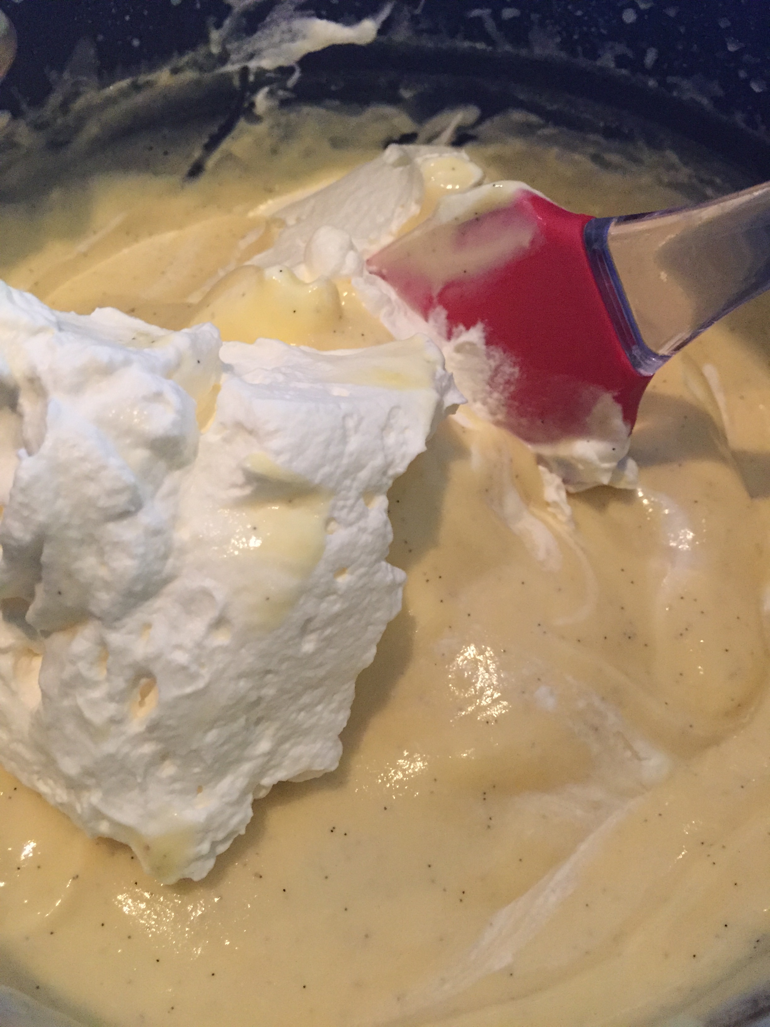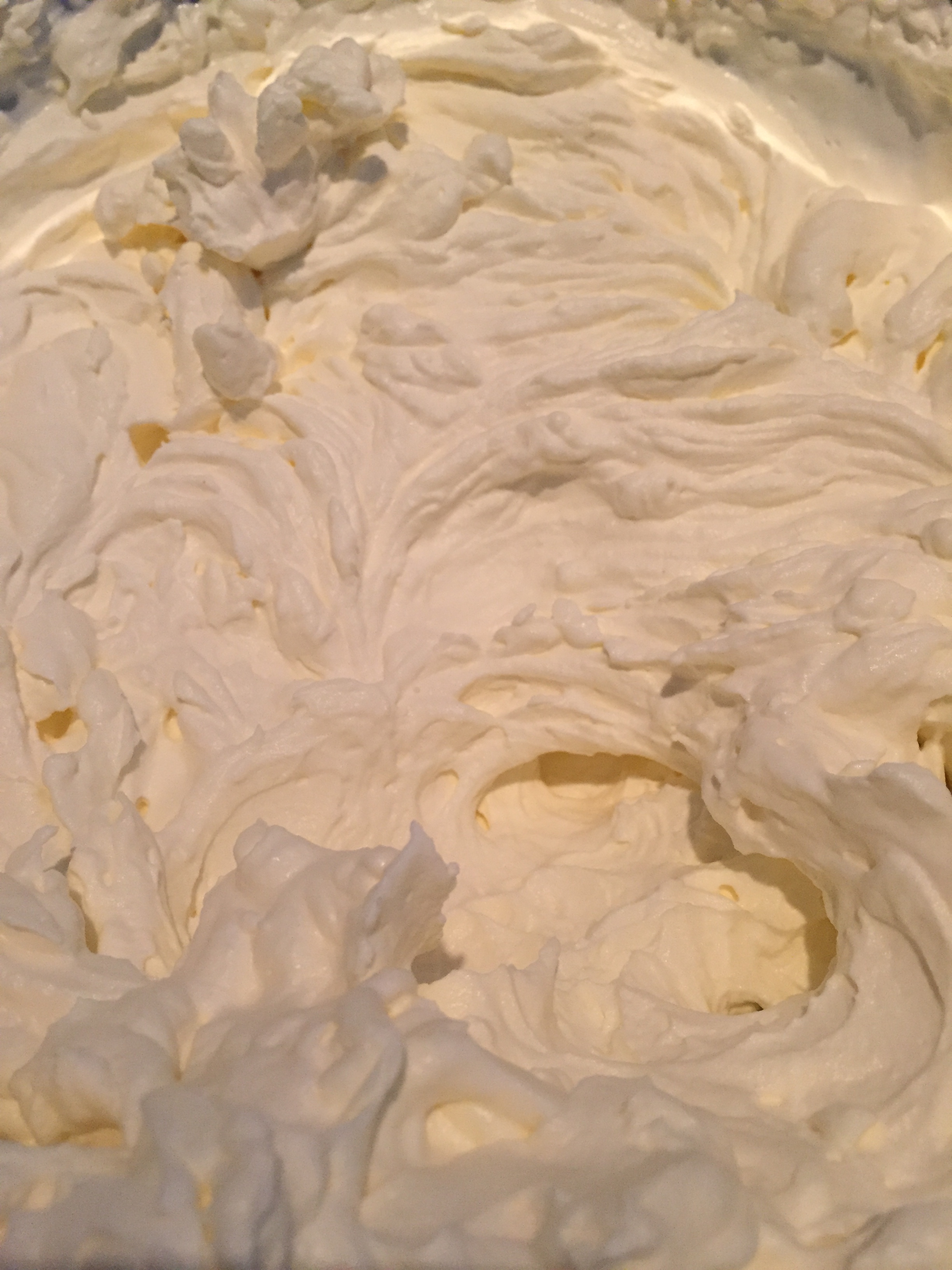 Når du nå skal blande disse, rør først vaniljekremen glatt og vend inn kremfløten FORSIKTIG med en slikkepott. Hvis ikke får du flytende krem over hele benken. Det har jeg også prøvd! Sett så kremen kaldt i 1-2 timer før du smører den på kaken.