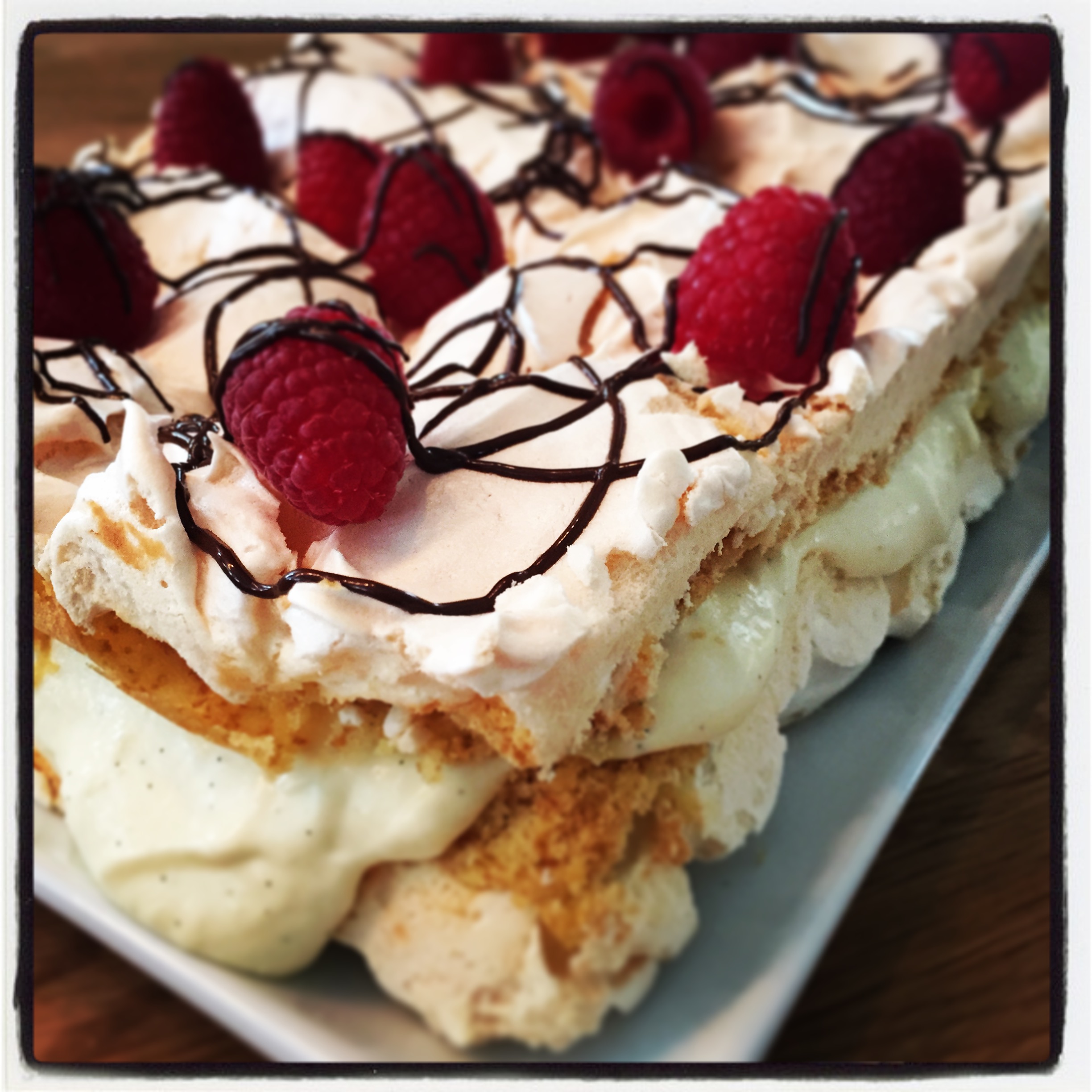 Ta så en spiseskje med melkeblandingen over i eggeplommene mens du visper godt. Dette gjentar du en 10 ganger slik at du får temperert eggeblandingen før du heller i resten av melka. På denne måten slipper du at du ender opp med en sprukken vaniljekremmasse. Når du har klart å blande all melka i eggeblandingen, så heller du alt tilbake i kasserollen. Nå skal blandingen varmes opp forsiktig til kokepunktet under stadig omrøring. Ikke bli fristet til å ta en liiiten pause for å sjekke fjesboka eller gå på do. Dette krever full konsentrasjon og blikket festet hardt oppi kasserollen. Nå skal massen gradvis stivne mens du rører og rører under oppkoking. Ikke la kremen koke, men rør som en gal slik at den blir tykkere uten at det bobler i kjelen. Når den er rømmegrøttykk+ er kremen ferdig. Tilsett romessens for en kulere smak på vaniljekremen. Ta så en gelatinplate og legg denne i kaldt vann i 10 minutter. Klem ut alt vannet, legg den i en skål og smelt i micro/evt. vannbad i noen sekunder til den er flytende. Rør så inn i vaniljekremen mens du pisker godt med en visp. Dekk kasserollen med plast og sett på lokk. Avkjøles i kjøleskap. Pisk så kremfløten stiv og sett kaldt.