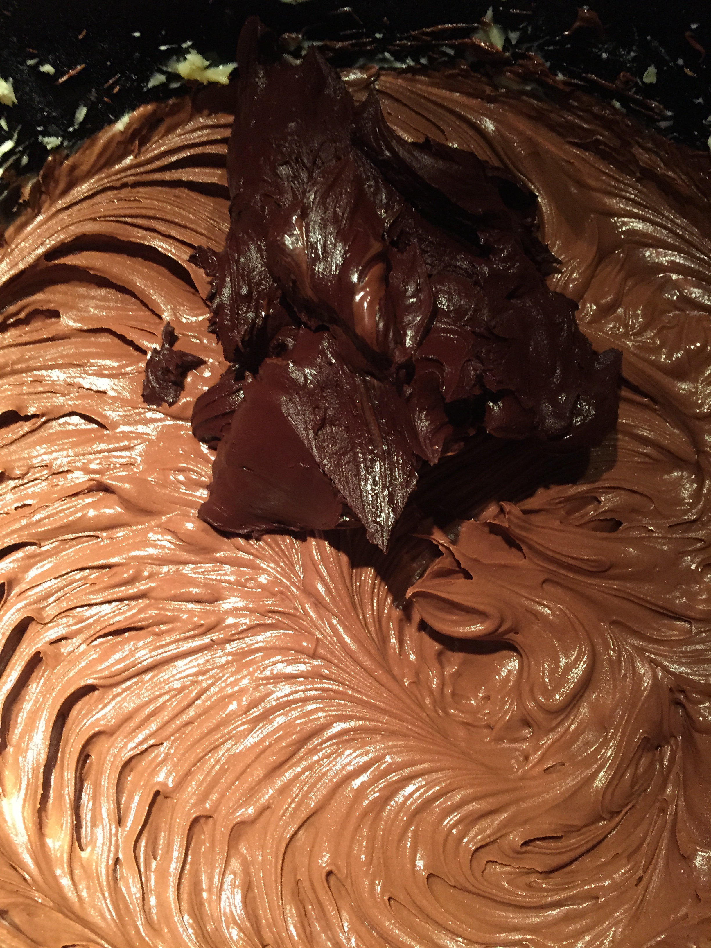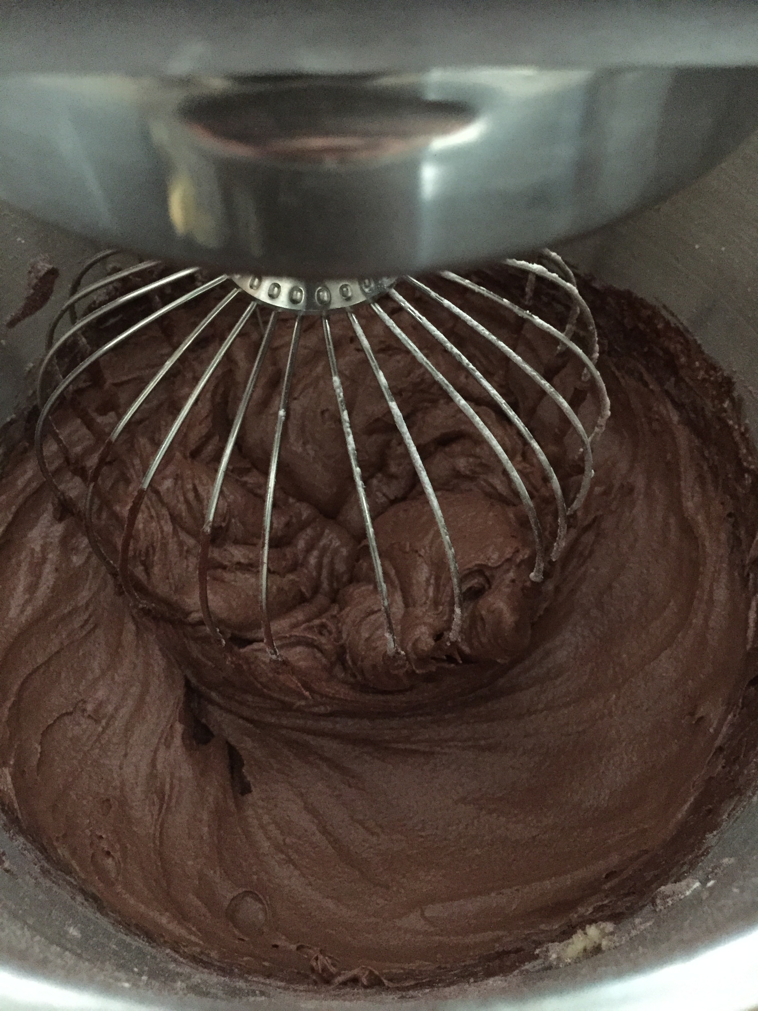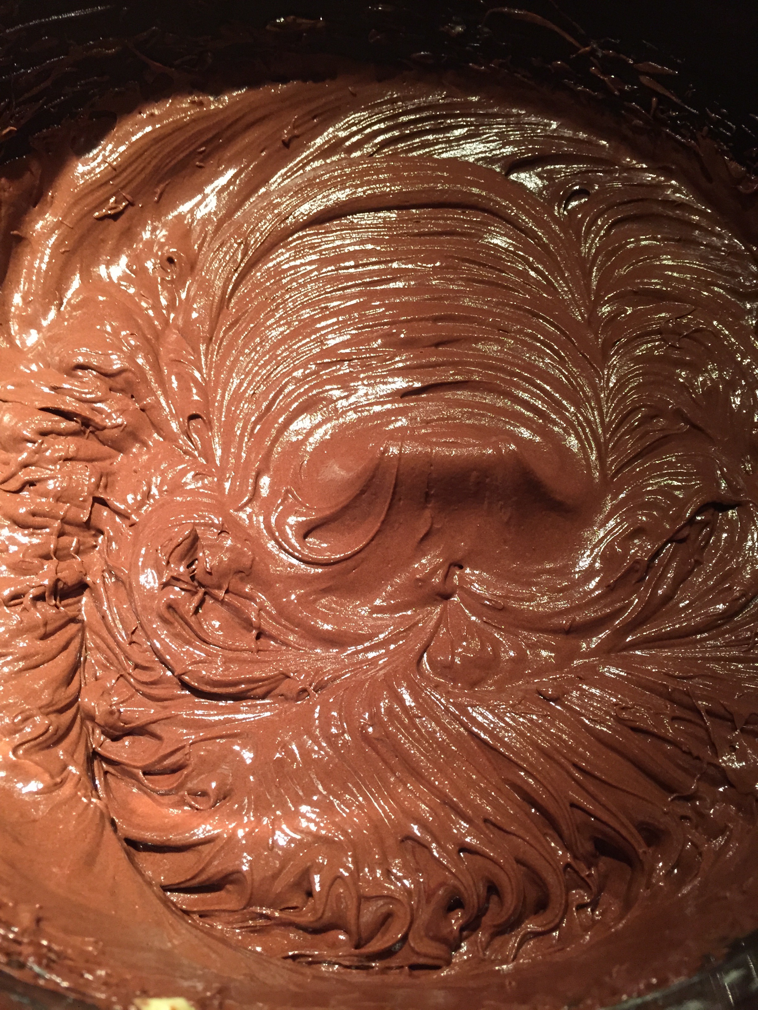 Mens denne avkjøles, så pisker du sammen romtemperert smør og melis til en luftig og lys masse. Tilsett den smeltede sjokoladen mens du lar mikseren gå på medium hastighet. Til slutt piskes kakaoblandingen inn.