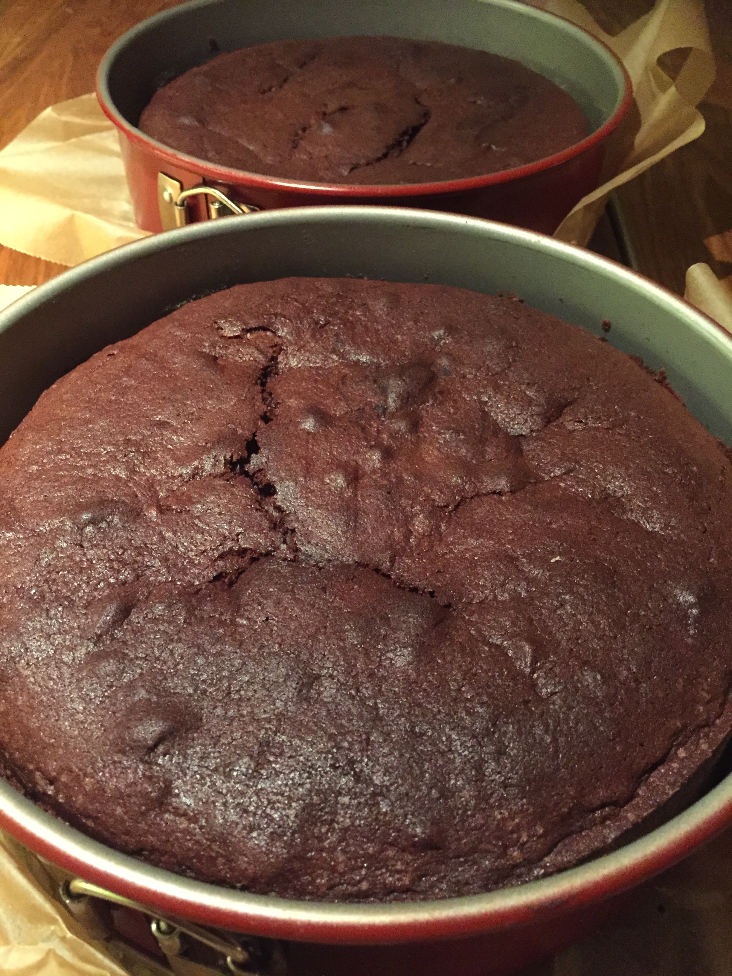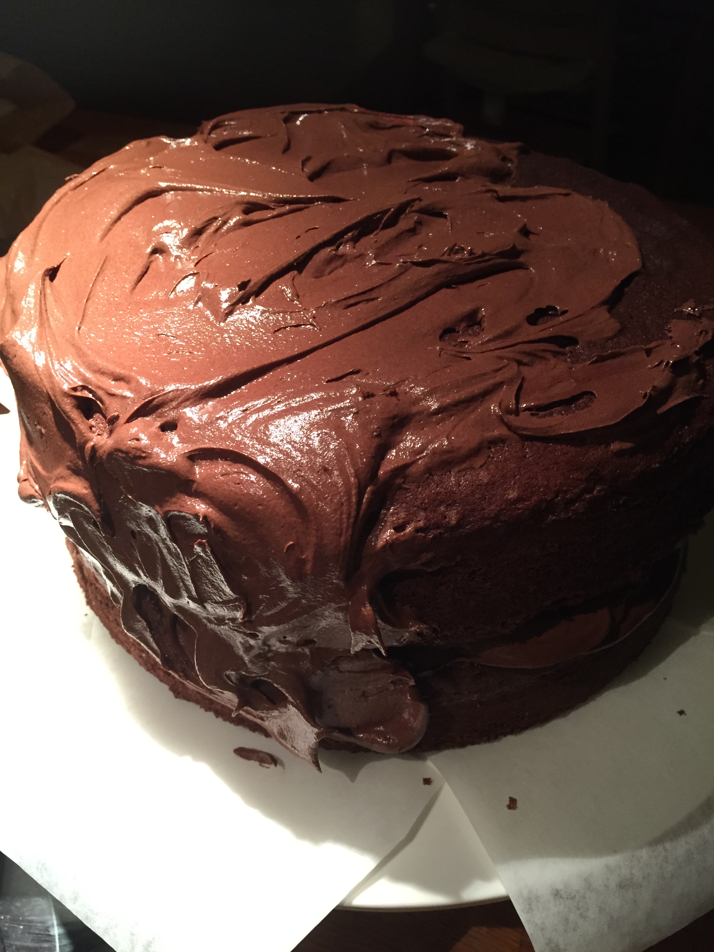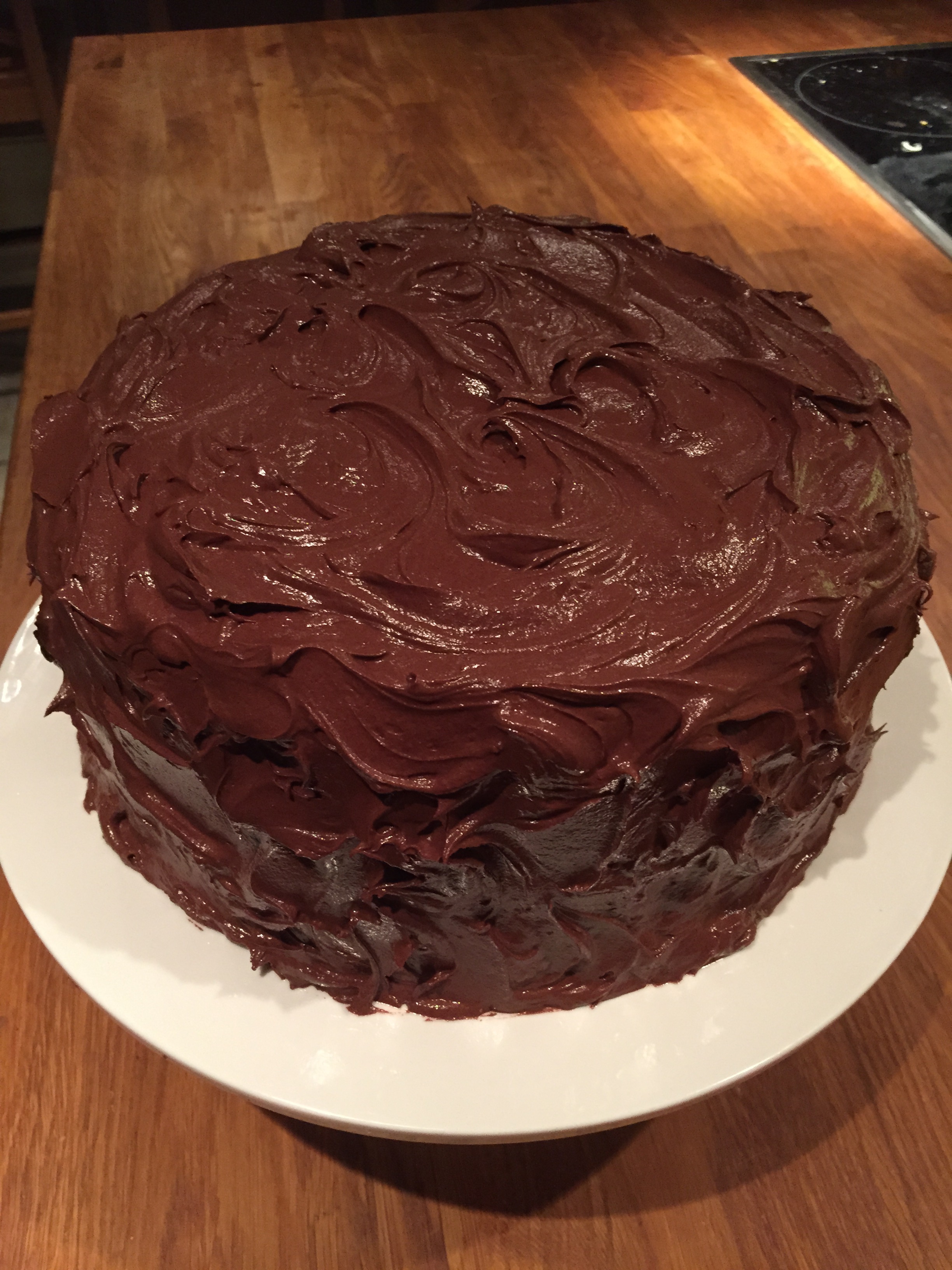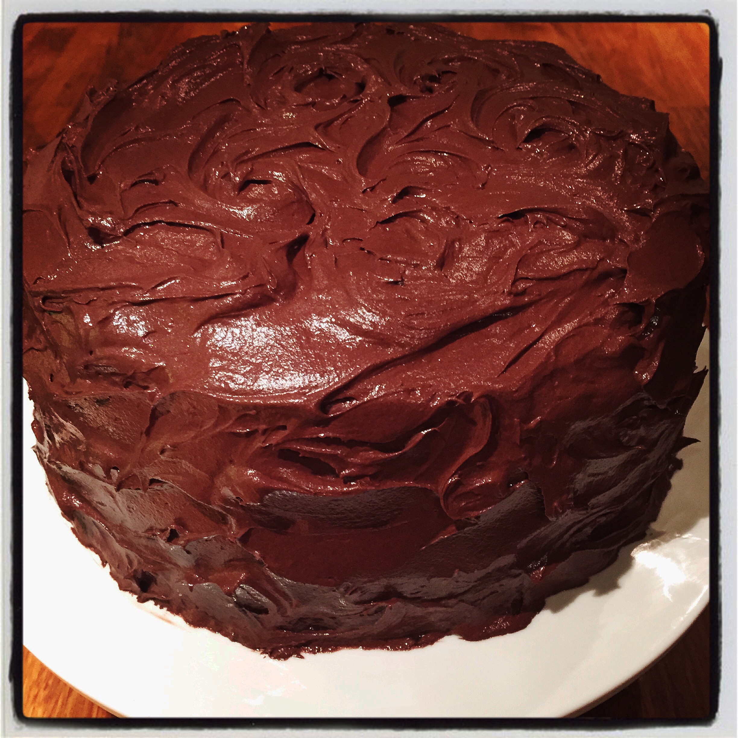 Marsapril 2015 234Jeg lovet jo å komme med en “skikkelig” kake som plaster på såret for forrige ukes knekkebrød. Så her kommer en real sjokoladebombe av en kake. For deg som liker høye, mørke, saftige, mektige kaker, så kan du trygt lese videre 😉 Denne kaken flott, høy og holder seg godt leeeenge om du oppbevarer den kjølig. Den er litt av et syn og vil garantert skape suksess på et hvert kakebord. Husk bare å ta den ut til temperering 3 timer før servering. En så stor sjokoladekake må tempereres for at den skal smake best med tanke på saftighet, mykhet og smak. Med 500 gram sjokolade i glasuren, blir nok denne en vinner for sjokoholikere som meg selv. God helg da folkens!
