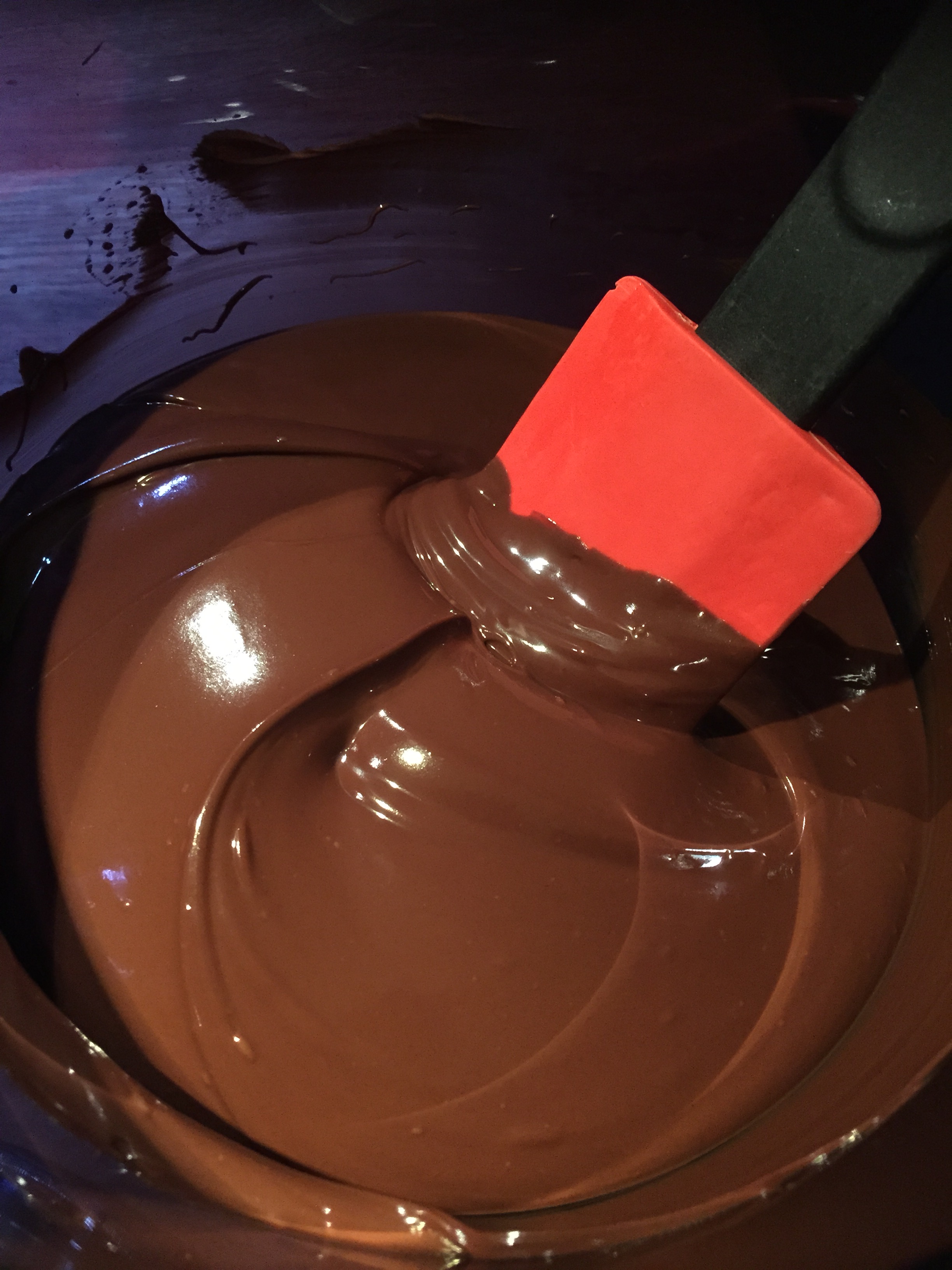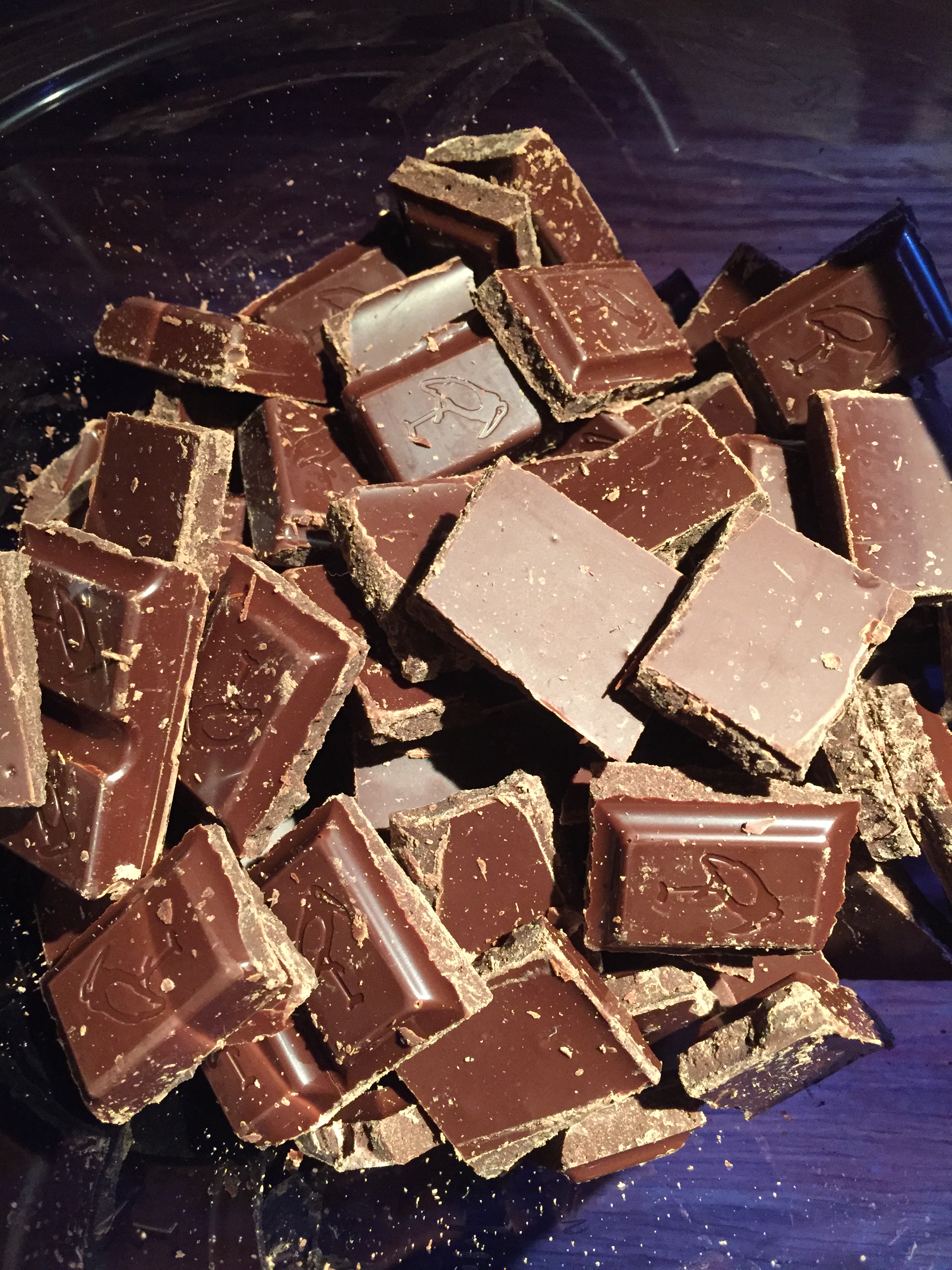 Hakk opp den enorme mengden med sjokkis og la den smelte over vannbad. Pass på at det ikke kommer vann i sjokoladen! Da blir det klumpetiklump rett og slett og det er dumt med så mye sjokolade 😦 Når sjokoladen er smeltet, og du har fått en jevn og glatt røre, avkjøler du den litt på benken/kjøleskap. Rør av og til for å unngå snerk og at den stivner. Sjokoladen skal kun avkjøles ned til romtemperatur.