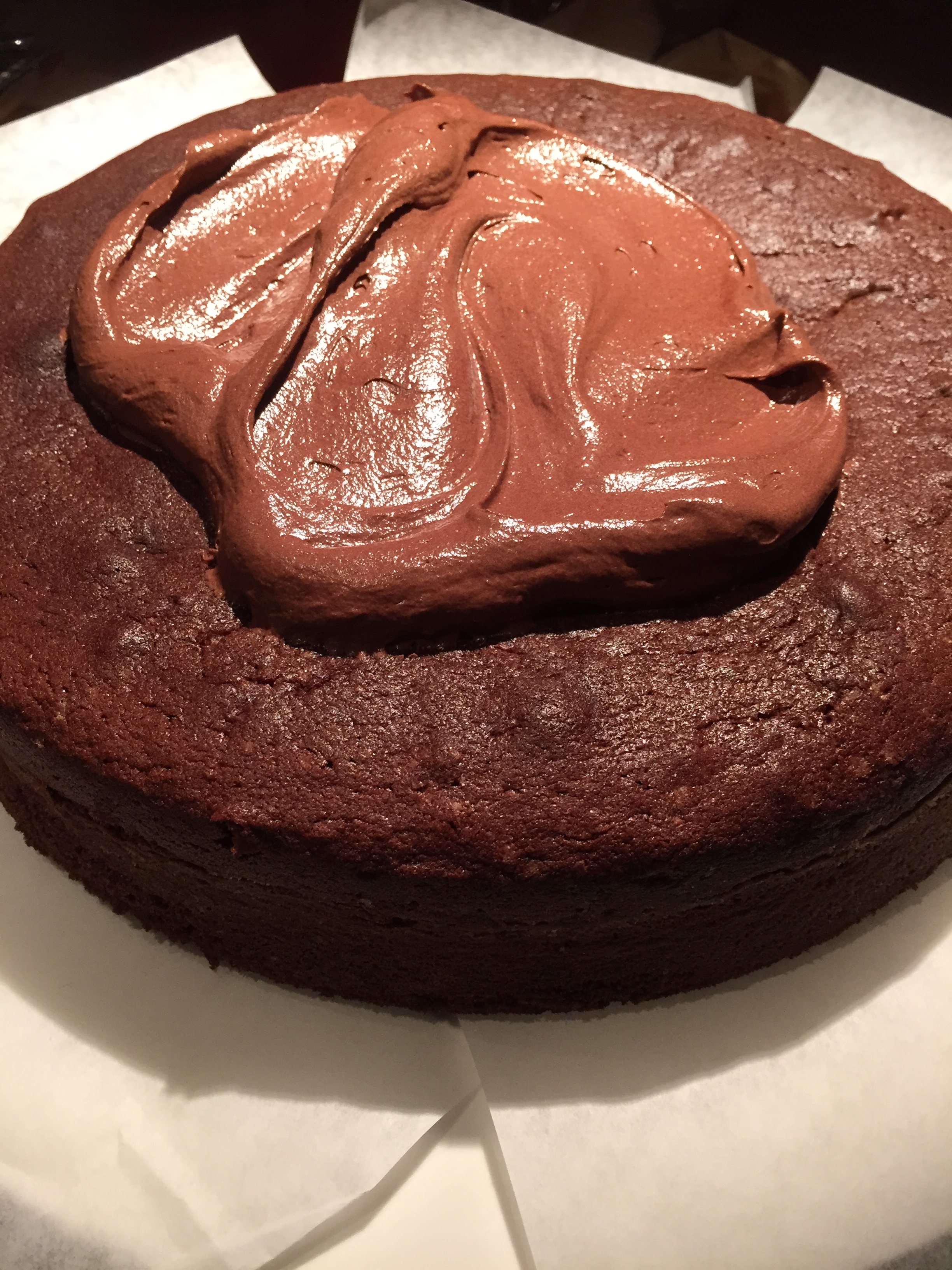 Kaken  monteres ved at du legger den ene bunnen på et kakefat, fordeler en god slump med glasur på. Ca. 1,5 cm høyde. Så legges den andre bunnen oppå. Dekk så kaken med resten av glasuren. Det blir rikelig med glasur, så ikke vær redd for å prøvesmake litt 😉 Jeg laget “mønster” med en spiseskje for et litt rustikk utseende. Fungerte rimelig greit det. Glasuren vil stivne i kjøleskapet.