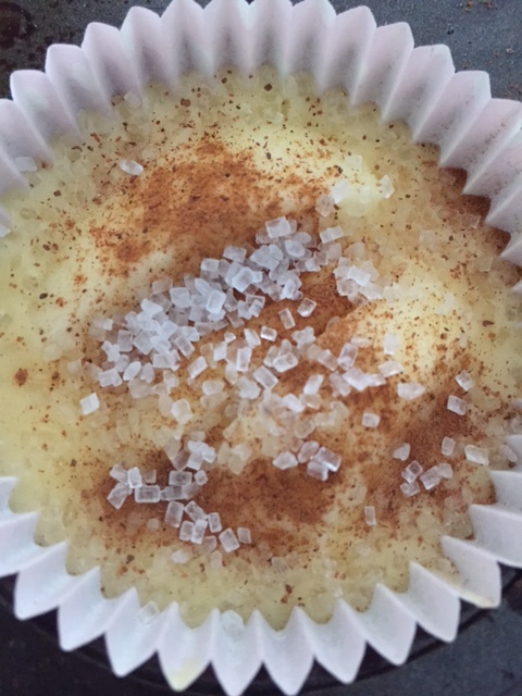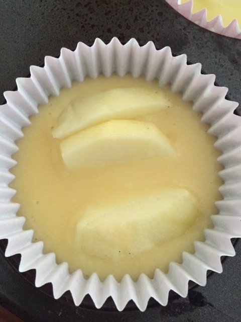Finn fram et stekebrett/muffinsbrett og sett utover muffinsformene. Fyll muffinsformene litt over halvfulle. Sett nedi 2-3 eplebåter slik at de ligger med den brede siden opp. Du kan også evt dele eplebåtene i mindre biter om du ønsker det og strø de litt rundtomkring. Trykk eplebåtene/bitene litt nedi røren. Strø over med kanel og perlesukker og sett muffinsene i ovnen.