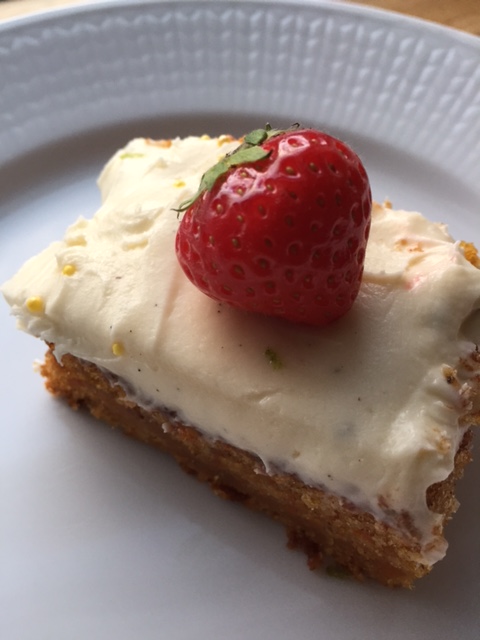 Av og til får man bare lyst på en deilig, saftig langpanne med masser av smak. Akkurat nå er norske gulrøtter på sitt beste og da er det dags for å bake gulrotkake. Denne kaken er sikker vinner både i selskap, på basaren og på fotballbanen. Oppskriften er opprinnelig fra det søte liv, men jeg har valgt å gjøre en vri med både innhold og ny topping. Det er noe med komboen kremost, lime og jordbær som er helt magisk. Prøv selv da vel og overrask noen med en deilig kake til helga. Smaker best på dag to, tre osv.. Så det er bare å sette i gang 🙂