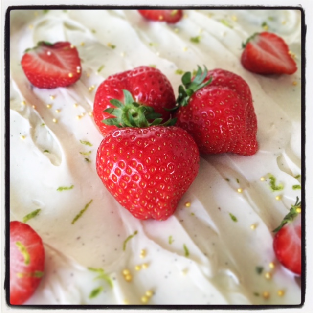 Pynt kaken med jordbær, skall av en 1/4 – 1/2 lime og gjerne noen lekre småperler (spisende ja) om du har liggende.