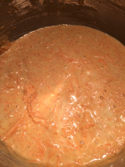 Så tar du å blander i gulrot- og epleraspet med en slikkepott. Vend inn til alt er blandet.