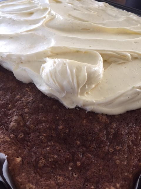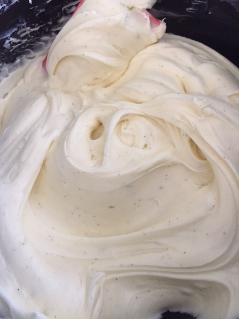 Skrap frøene fra en vaniljestang med en kniv og tilsett i ostemassen. Riv skall fra en halv lime og tilsett dette sammen med saften fra en halv lime. Her kan du smake deg litt fram til hva du synes er nok limesaft. Jeg ønsker en topping som er søt, kremet og fyldig, men samtidig med et friskt touch av lime. Rør sammen og bre kremen over den nå avkjølte kaken.