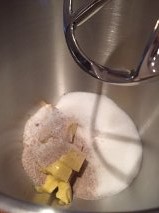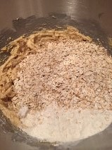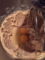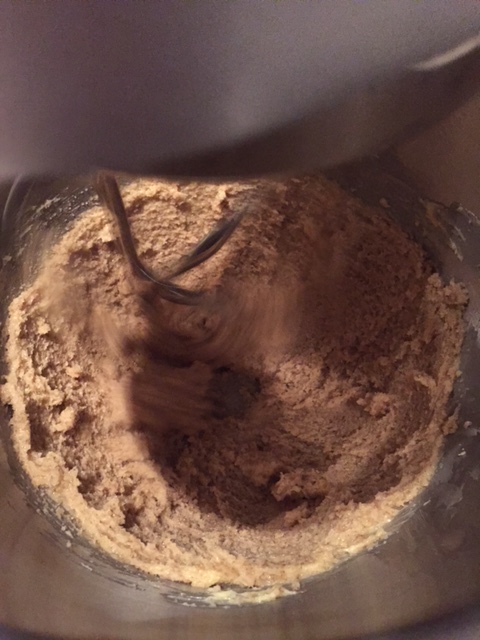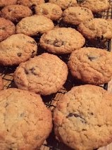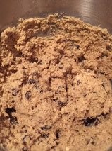 Romtemperer smøret og pisk sukker (hvitt og brunt) sammen med smøret i en bolle med miksmaster/kjøkkenmaskin. Pisk til du har fått en jevn masse (ca.3 min). Tilsett eggene og pisk litt videre til alt er godt blandet. Ha i alt det tørre bortsett fra rosiner og hakket sjokolade og bland dette godt inn. Når alt er blandet, så tilsetter du rosiner og hakket sjokolade og mikser dette fort sammen.